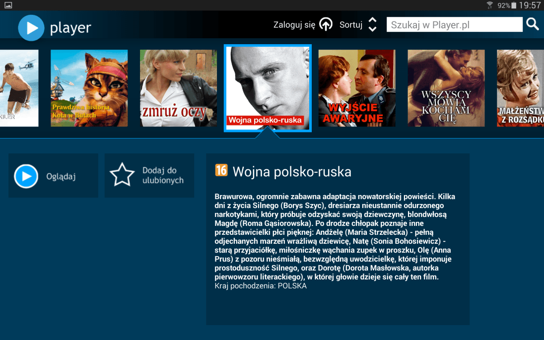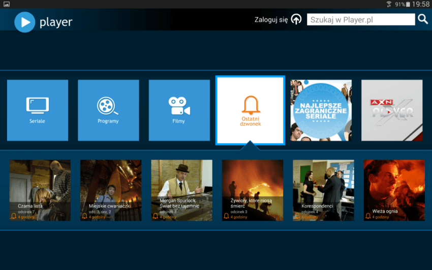 Ekran startowy jest na pierwszy rzut oka dość przejrzysty. Do dyspozycji mamy dwa przewijalne pasy, z których jeden to kategorie, a drugi wyróżnione filmy lub seriale. Możemy także skorzystać z wyszukiwarki, jeśli interesuje nas konkretny program, a także zalogować się. Utworzenie konta w aplikacji pozwala na kontynuowanie oglądania na innym urządzeniu, w miejscu, w którym przerwaliśmy. Mała rzecz, a cieszy. W aplikacji nie znajdziemy za to żadnego odnośnika do opcji czy ustawień.
