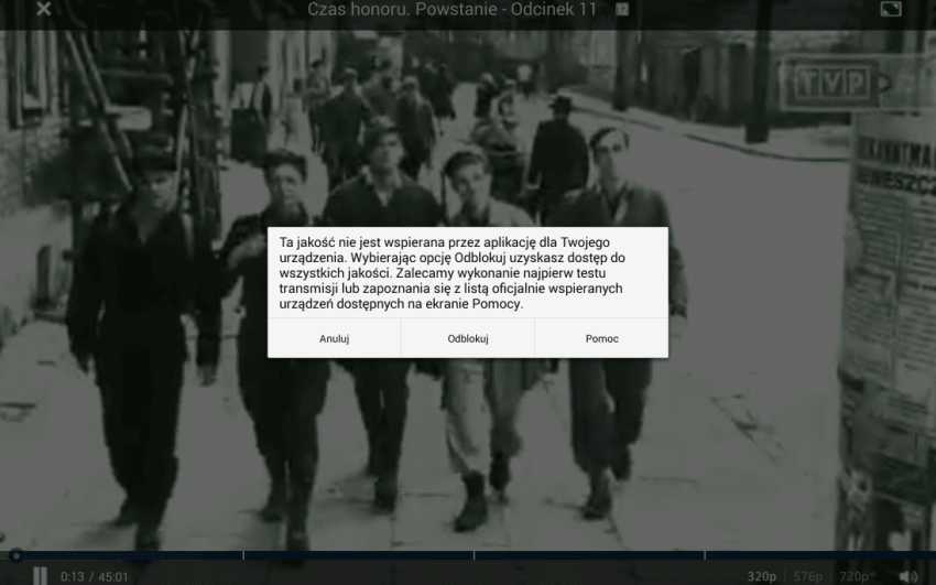 Podczas oglądaniu materiałów również możemy samodzielnie ustawić ich jakość. Spotka nas jednak nie małe rozczarowanie. Aby zmienić rozdzielczość na większą niż 320p wymagany jest zakup pakietu Extra. Jego cena to 4,90 za 30 dni, więc relatywnie niedużo, sporo jednak, jeśli interesuje nas tylko jeden, konkretny odcinek. Oczywiście wciąż możemy oglądać materiał za darmo w 320p, jednak jakość wtedy będzie bardzo niska.