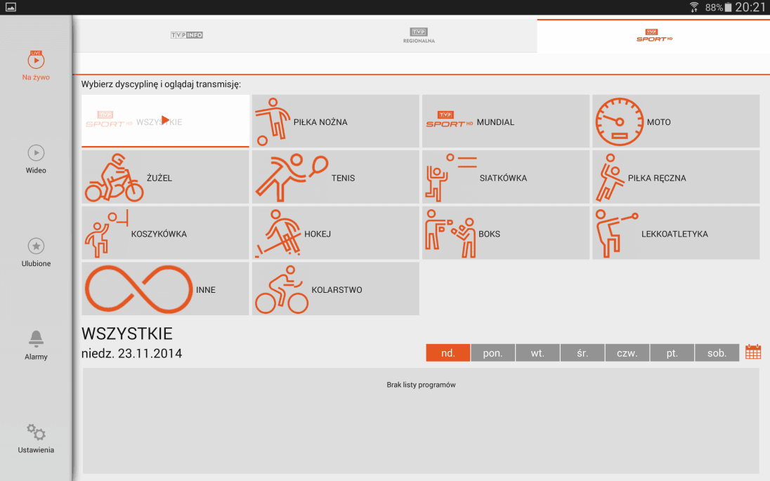 Aplikacja od TVP ma najsłabszą ofertę – nie znajdziemy tu seriali oferowanych w Ipli, ale jednocześnie jest jedyną pozwalającą na oglądanie kanałów telewizyjnych w czasie rzeczywistym. Nie ma tu jednak „streamingu” najpopularniejszych kanałów jak TVP1 i TVP2, ale jedynie kanały tematyczne jak INFO, Sport i Regionalne.