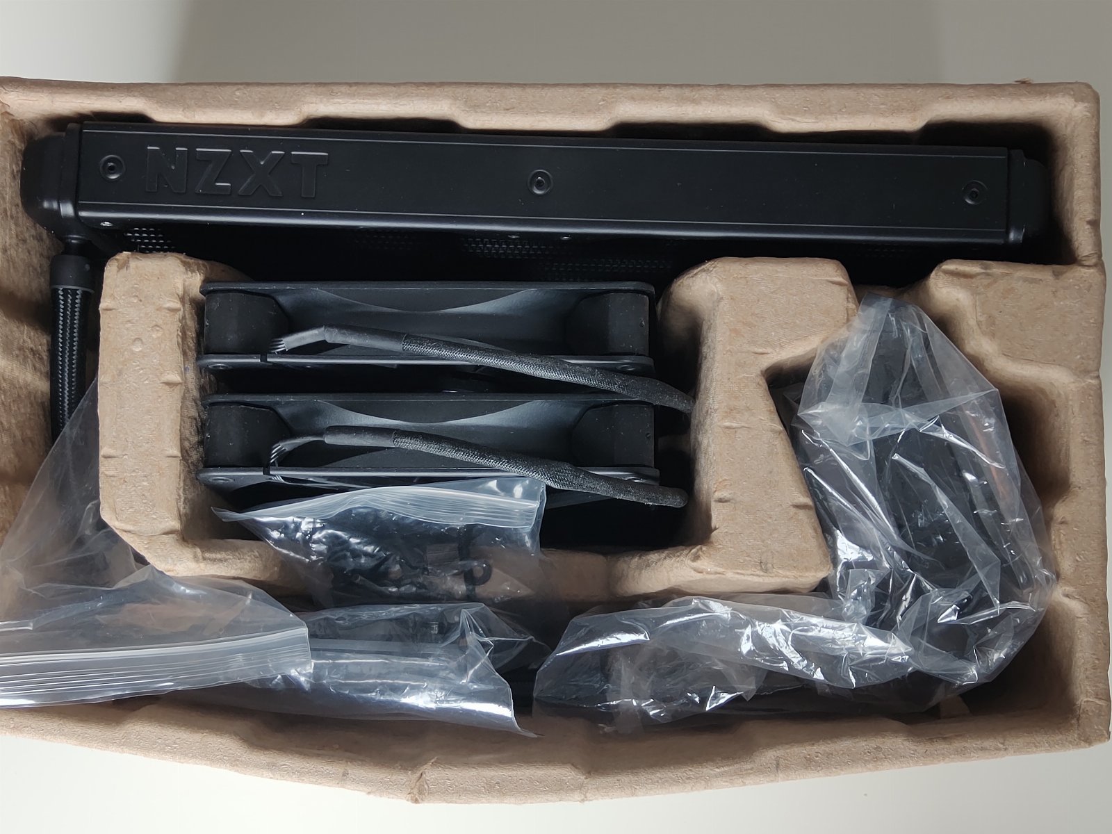 Szczególnie na tym estetycznie wyglądającym pudełku. Dominującymi kolorami są biel oraz fiolet, lecz na froncie przede wszystkim wybija się grafika w bardzo elegancki i minimalistyczny sposób prezentująca nasze nowe chłodzenie. Na prawym boku znajdziemy pełną specyfikację w języku angielskim, tył wspomina oprogramowanie (chociaż w starszej wersji niż tej, którą miałem okazje testować) oraz krótkie opisy zastosowanych komponentów. Lewy bok to skrótowe hasła opisujące produkt w kilku językach – polskiego brak. Z zewnątrz kusi, co natomiast znajdziemy w środku? Wszystkie podzespoły zostały bezpiecznie zapakowane w odpowiednio przygotowanym kartonie. Do zestawu dołączono dwie szyny do montażu na procesorach AMD oraz Intela, kołki dystansujące oraz dużą ilość nakrętek, śrubek, podkładek oraz kabli. Sama pompka wygląda naprawdę ładnie, NZXT przy jej projektowaniu skupiło się na efekcie nieskończonego lustra, które to sprawia wrażenie ciągnięcia się no cóż – bez końca. Same węże w oplocie prezentują się również bardzo dobrze, przede wszystkim nie wyglądają tandetnie, a raczej sprawiają wrażenie solidnych. To samo tyczy się złączy przy pompie. Nie są one sztywno przymocowane, lecz pozwalają na ruch w zakresie około 100*, przez co łatwiej je ułożyć podczas montażu. Radiator, oprócz tego, że jest dosyć gruby oraz bardzo gęsto upakowany finami (żeberkami), jest też dosyć szczupły, co zmniejsza problemy z umiejscowieniem go w naszej obudowie.