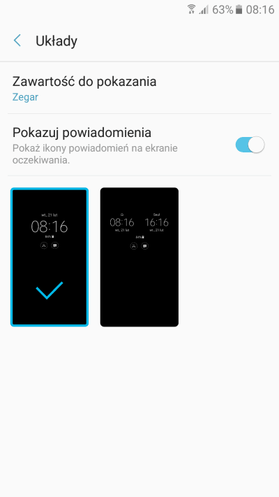 I przy tym ostatnim warto na chwilę się zatrzymać i z całą pewnością należy zwrócić uwagę na dostępność funkcji Always On Display, bowiem jest to pierwszy „średniak” w ofercie Samsunga, który ją oferuje. Z racji tego, że Galaxy A5 2017 nie ma diody powiadomień (bo nie ma), Always On Display jest jedyną opcją, by o wszelkich pominiętych powiadomieniach dowiadywać się prosto z ekranu bez konieczności jego podświetlania. Oczywiście korzystanie z Always On Display jest dobrowolne – ja na przykład w większości mam tę funkcję wyłączoną, a włączam jedynie na spotkania towarzyskie, podczas których mam pogląd na to, czy coś ważnego się nie dzieje np. w mejlach czy na Slacku. Always On Display może wyświetlać zegar (z jednej lub dwóch stref czasowych), kalendarz lub jeden z czterech obrazów oraz – w dwóch pierwszych przypadkach – powiadomienia w postaci ikon aplikacji wraz z cyfrą oznaczającą ich liczbę.