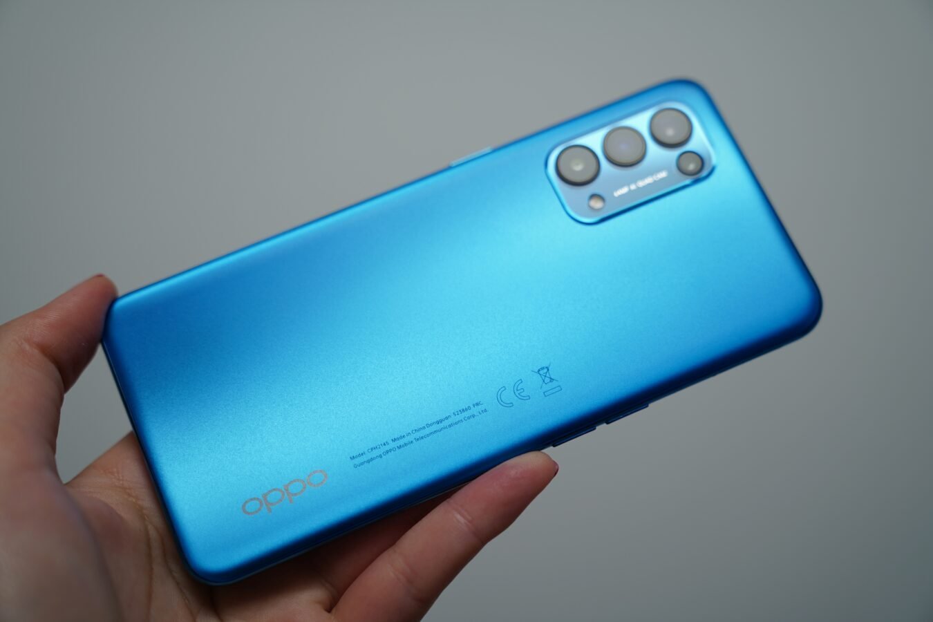 Do mnie trafił Oppo Reno 5 5G w wersji niebieskiej i, wierzcie mi, robi ona świetne pierwsze wrażenie. Błyszcząca ramka z niebiesko-błękitnym matowym tyłem wywołały u mnie pozytywne emocje. Być może zasługą tego jest nie tyle kolor, co bardzo specyficzna i wyczuwalna faktura plecków urządzenia.