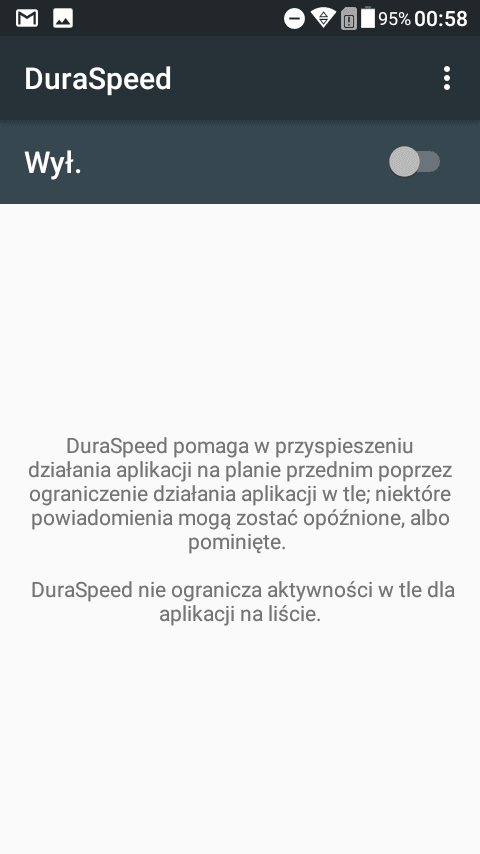 Jedynym dodatkiem w ustawieniach jest opcja DuraSpeed, która pomaga przyśpieszyć działanie urządzenia poprzez ograniczenie aplikacji pracujących w tle. Możemy w niej wybrać, które programy będą cały czas aktywne, a które zostaną zamknięte, gdy ich nie będziemy używać.
