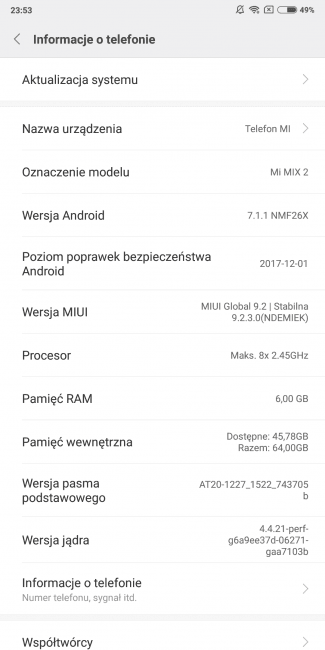 Pamięć wbudowana w testowanym przeze mnie Xiaomi Mi Mix 2 ma pojemność 64GB, z czego dla użytkownika zostaje około 55,5 GB. Na rynku dostępne są też wersje 128 GB lub 256 GB. Jest to stosunkowo istotna informacja, ponieważ smartfon nie obsługuje kart pamięci, więc ewentualnym wyjściem w sytuacji braku wolnej pamięci jest chmura.