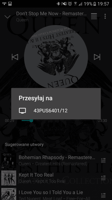 W zaktualizowanej aplikacji podczas odtwarzania muzyki lub oglądania teledysku widać zintegrowany przycisk Cast. Oczywiście domyślnie odtwarzanie multimediów rusza na naszym urządzeniu, ale można wybrać opcję strumieniowania do Chromecasta. Będzie to możliwe dopóki, dopóty oba urządzenia będą w tej samej sieci.