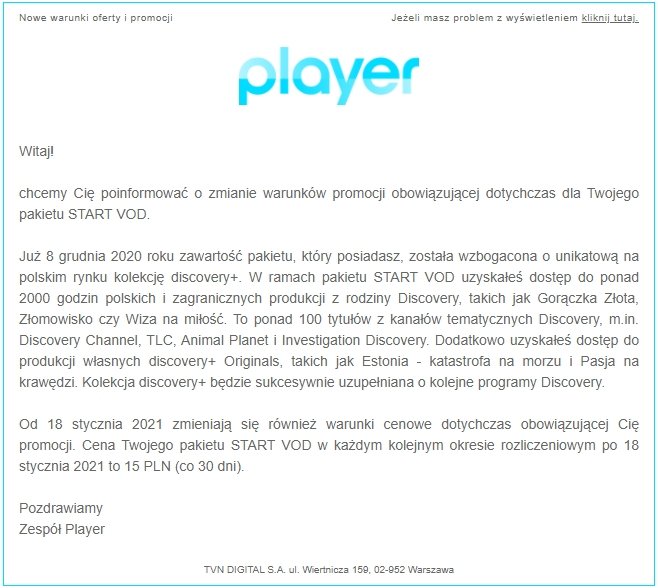 Użytkownicy pakietu START VOD otrzymują jednak informację od Playera, że od teraz będą musieli zapłacić za niego więcej, bo 15 złotych miesięcznie, a nie 10 złotych, jak do tej pory.