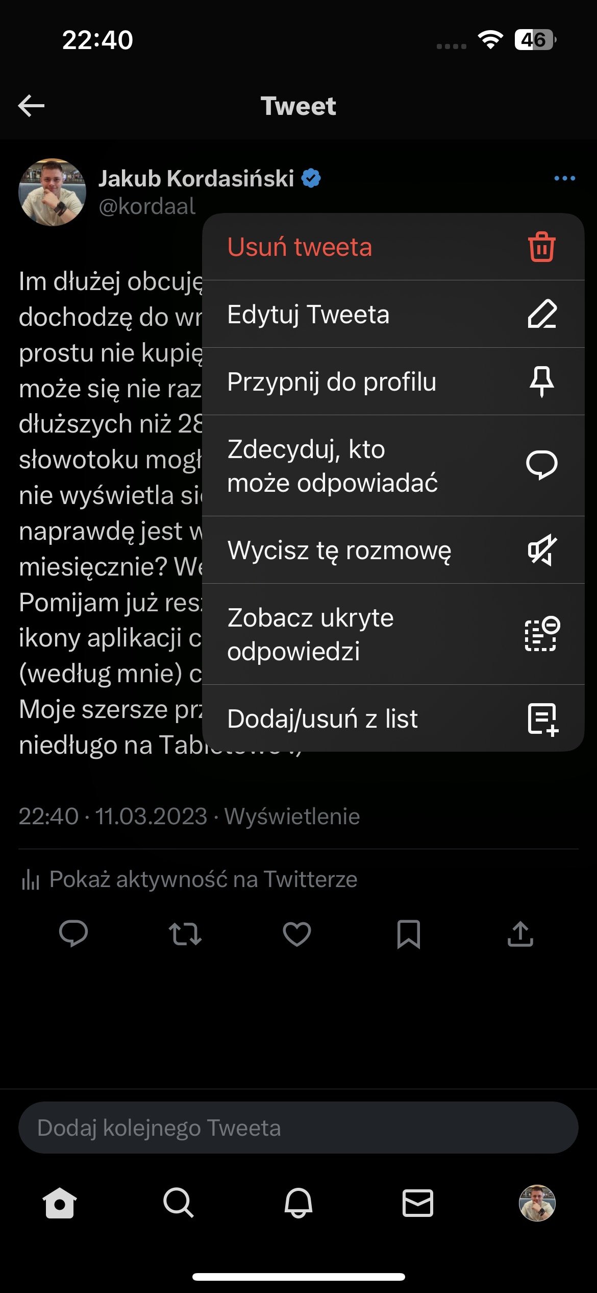 To były te ważne elementy, przejdźmy teraz do tych mniej istotnych. Twitter Blue gwarantuje nam rzekomo o połowę mniej reklam i postów sponsorowanych na timeline. Mam wrażenie, że u mnie i tak pojawia się ich niemal tyle samo.