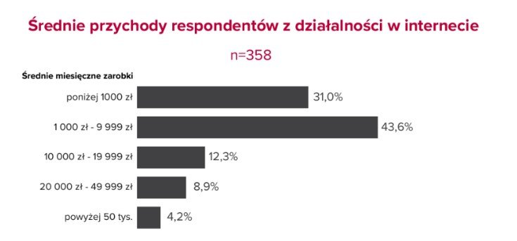 W badaniu zapytano ankietowanych o czas poświęcany na pracę online. Ponad połowa osób oszacowała, że na tworzenie przeznacza około 20 godzin tygodniowo. Zasada jest dość prosta – im więcej godzin spędza się na działalności, tym wyższe uzyskuje się zarobki.