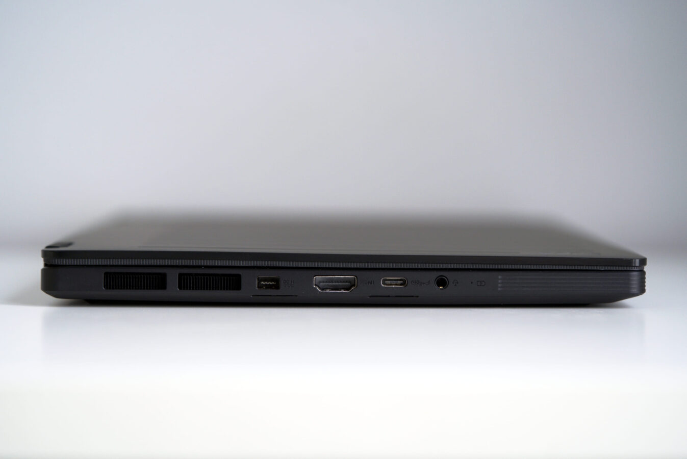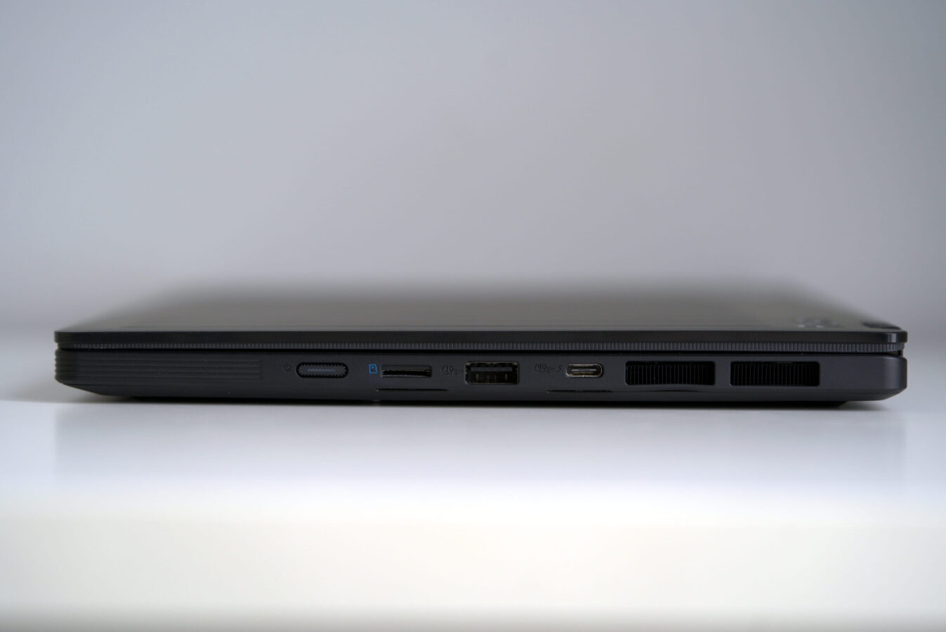 A samo zaplecze portów i złączy jest bogate. Na lewej krawędzi mamy port zasilania, pełnowymiarowe HDMI 2.1, USB C 4.0 Gen 3 (40 Gbps) oraz 3.5 mm jack audio. Na prawej krawędzi z kolei ulokowano drugie USB C 4.0 Gen 3 (też 40 Gbps), USB A 3.2 Gen 2 (10 Gbps), slot kart microSD 4.0 oraz włącznik.