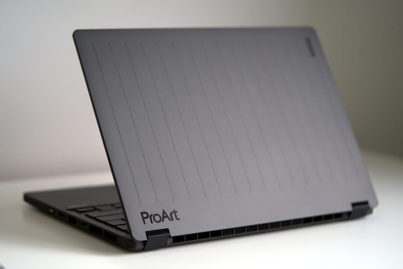 Wystarczy pierwszy rzut oka na klapę laptopa po wyjęciu go z pudełka, by dostrzec nawiązanie do designu kamerek GoPro – i nie mam tu na myśli samego logo marki w rogu. Obudowa ProArta PX13 w tej konkretnej wersji ma czarne, metalowe wykończenie z wygrawerowanymi CNC poziomymi liniami, nawiązującymi do obudowy GoPro. Fajny detal, dzięki któremu GoPro Edition wygląda o wiele lepiej od podstawowej edycji ProArt PX13.