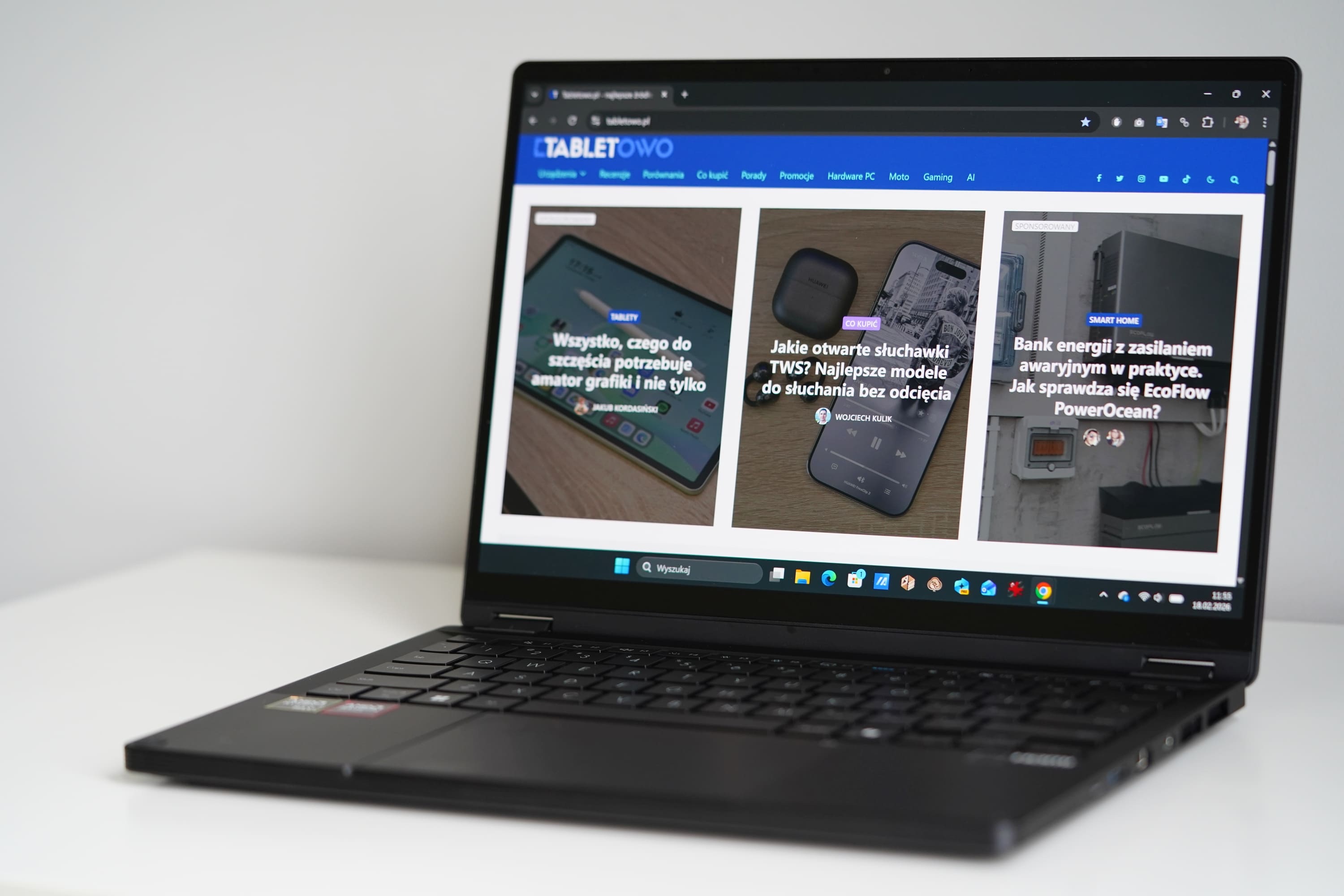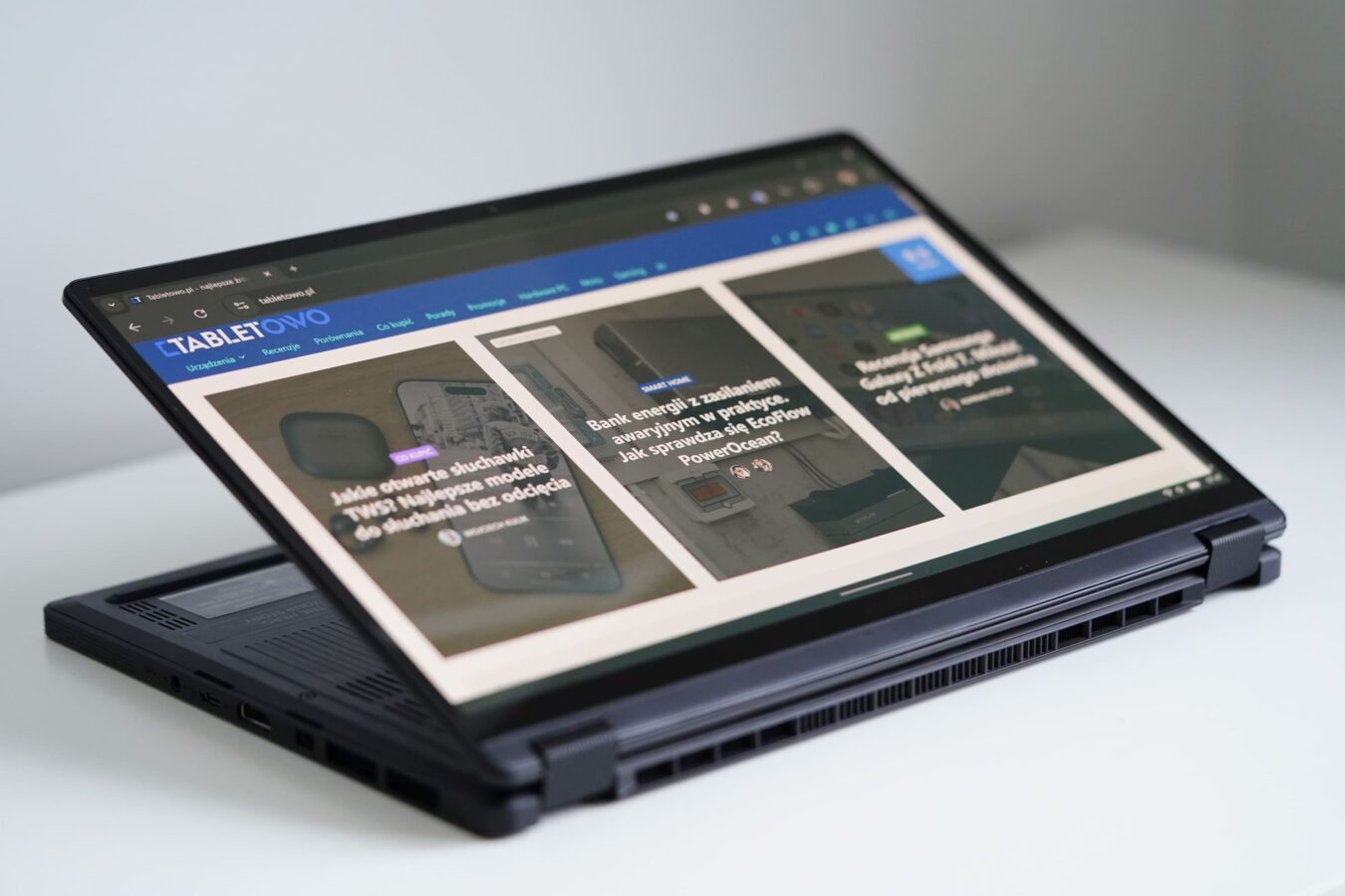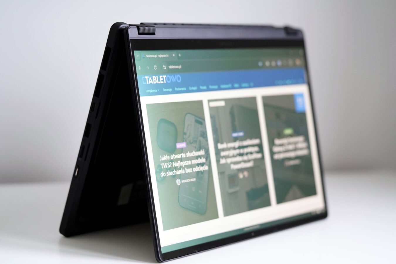 Osobiście, zwłaszcza do pracy w trasie, preferuję matowe ekrany, ale do błyszczącego – jak w tym przypadku – też jestem w stanie szybko przywyknąć. Zwłaszcza, gdy ma dodatkowy atut, a tutaj mamy z takim do czynienia. Mowa o możliwości obracania ekranu o 360 stopni, dzięki czemu można z niego korzystać w trybie namiotu czy tabletu (zwłaszcza tak wygodniej jest korzystać z rysika).