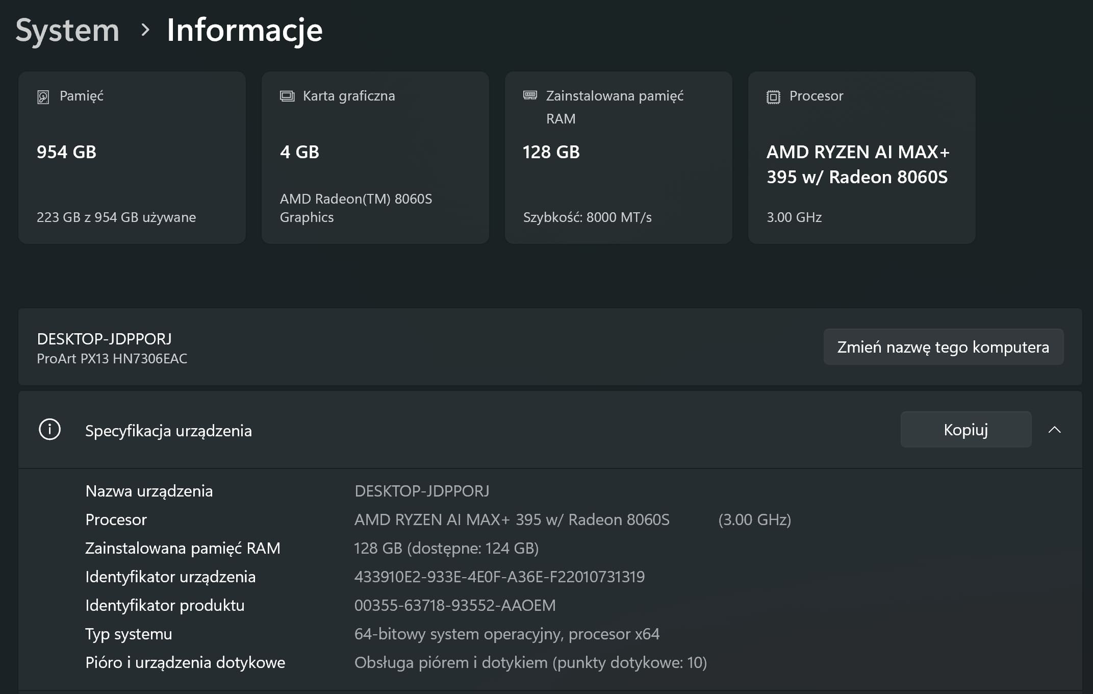Bo – tak – AMD Radeon 8060S to zintegrowana grafika, ale działająca na zupełnie innych zasadach. Korzysta z dobrodziejstwa ogromnej ilości superszybkiego RAM-u (w tym przypadku mamy go przecież aż 128 GB!) i nowej architektury, wspieranej dodatkowo przez potężne NPU XDNA do zadań AI.