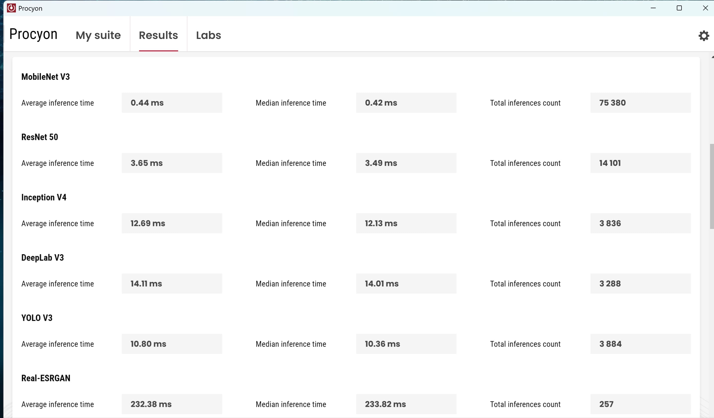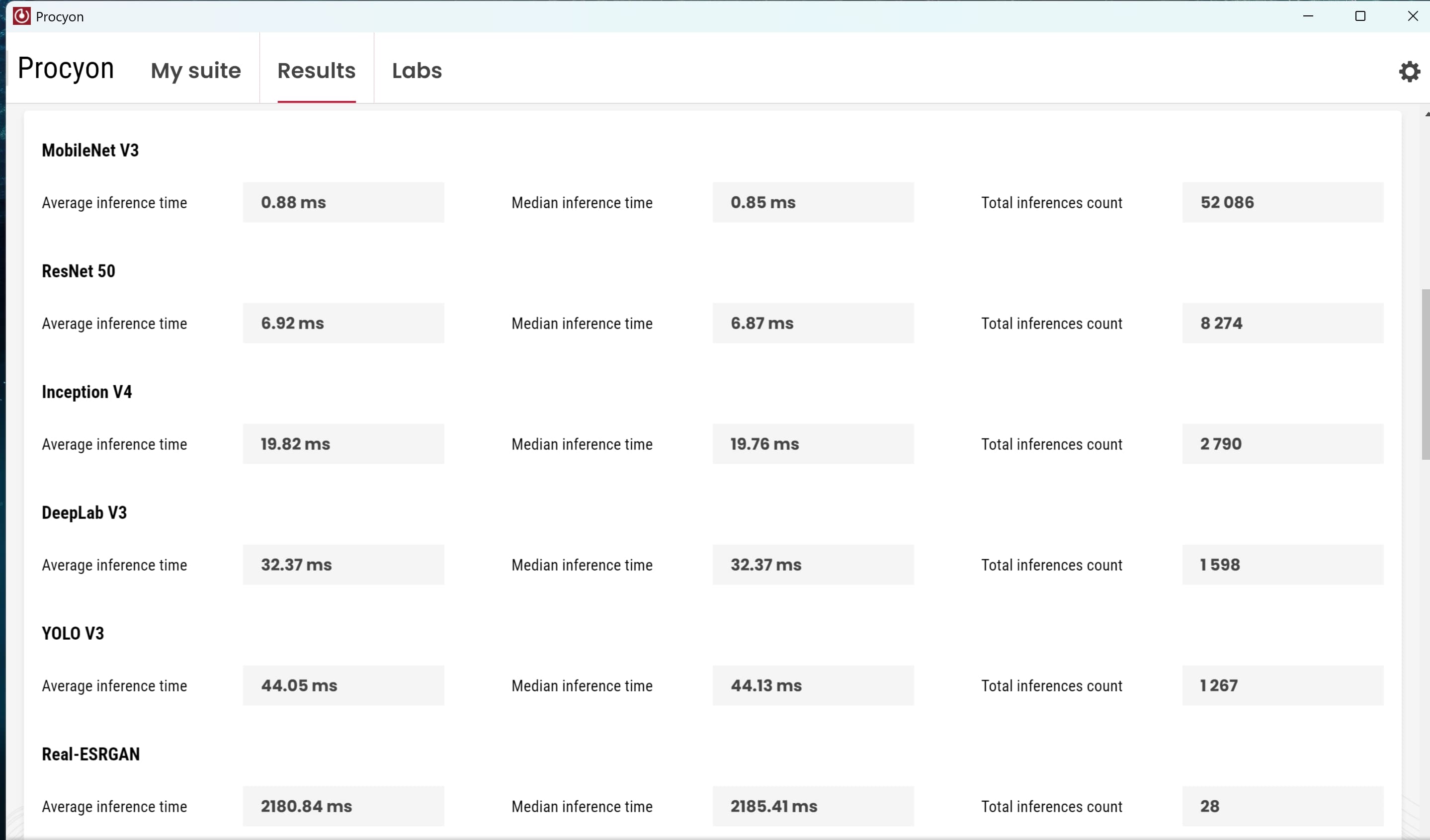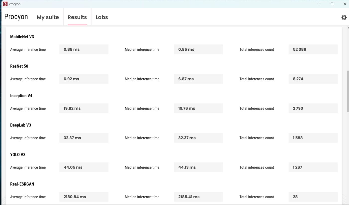 Przydałby się jeszcze benchmark AI, a tu z pomocą przychodzi Procyon i testy wchodzące w jego skład. Patrząc na wyniki trudno nie uznać ProArta PX13 za świetny sprzęt do korzystania ze sztucznej inteligencji lokalnie: