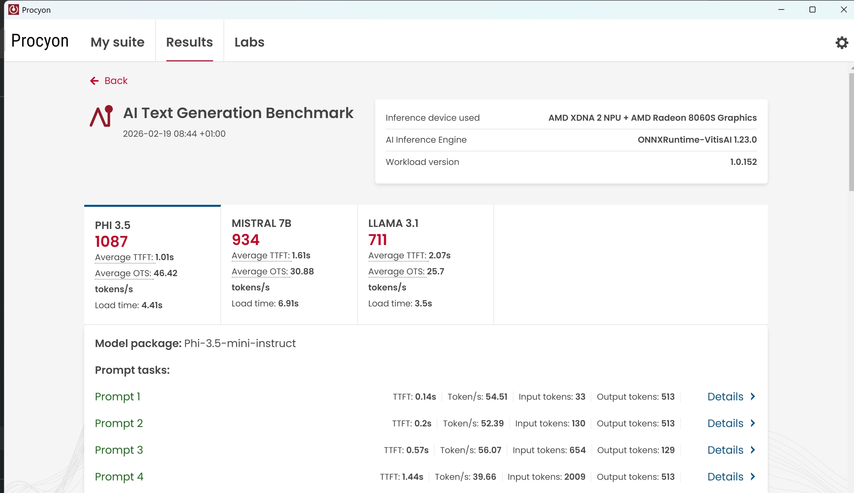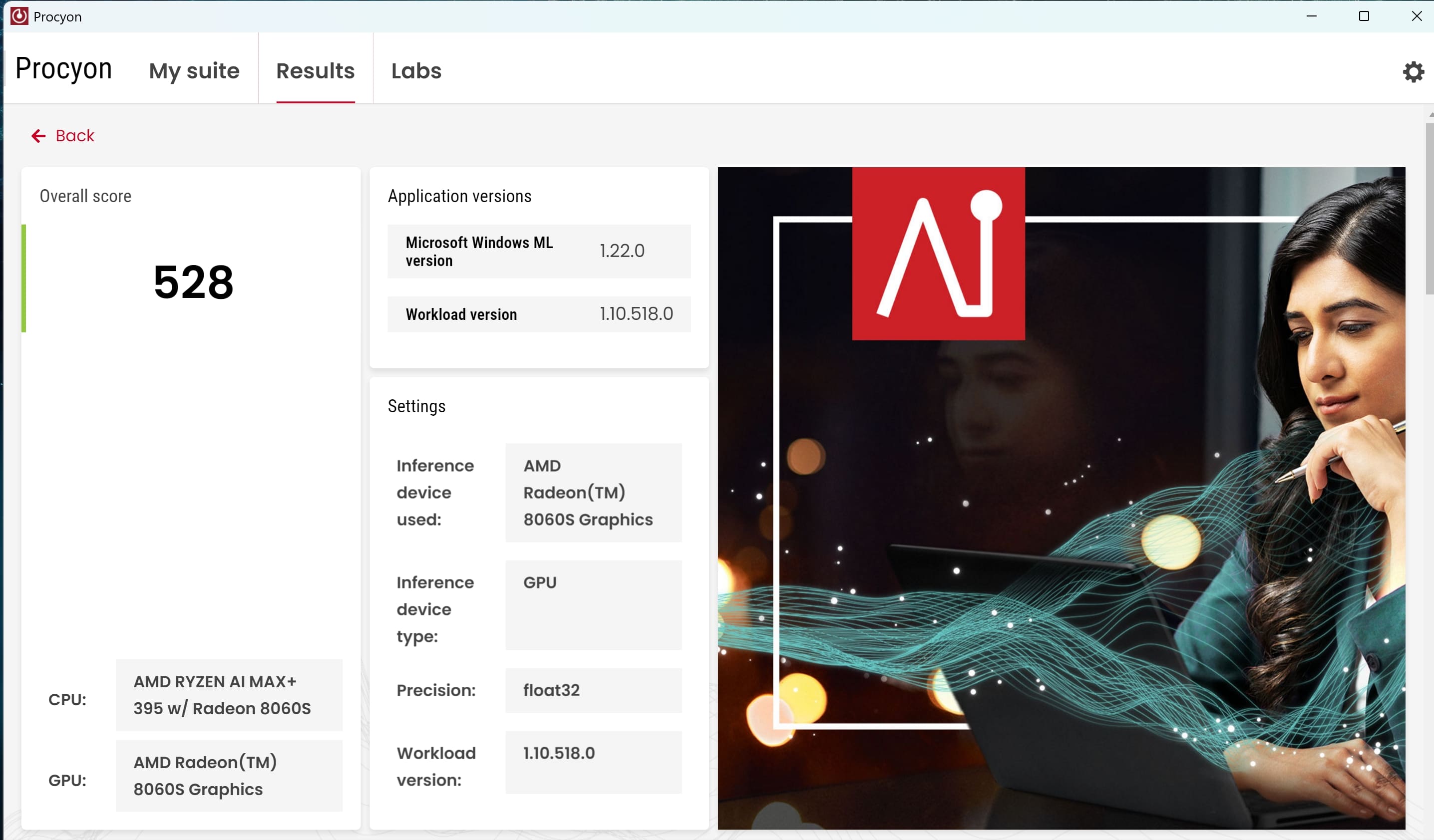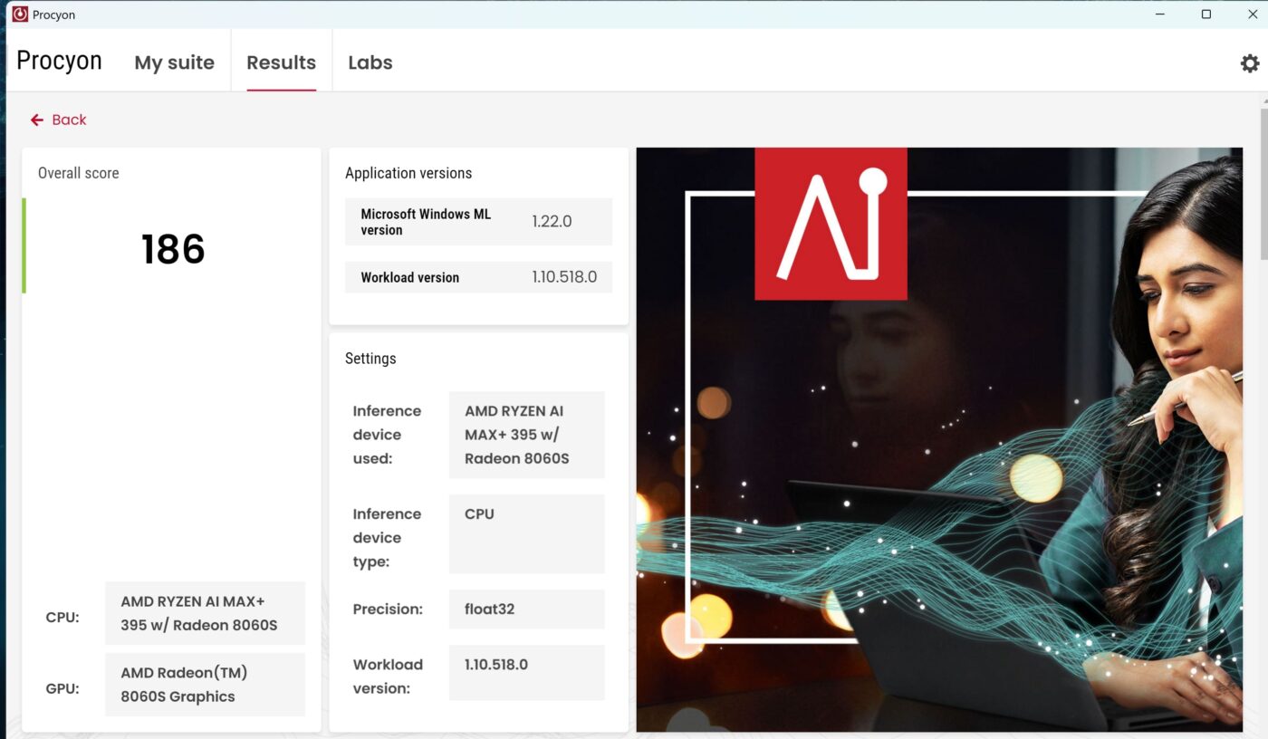 Przydałby się jeszcze benchmark AI, a tu z pomocą przychodzi Procyon i testy wchodzące w jego skład. Patrząc na wyniki trudno nie uznać ProArta PX13 za świetny sprzęt do korzystania ze sztucznej inteligencji lokalnie: