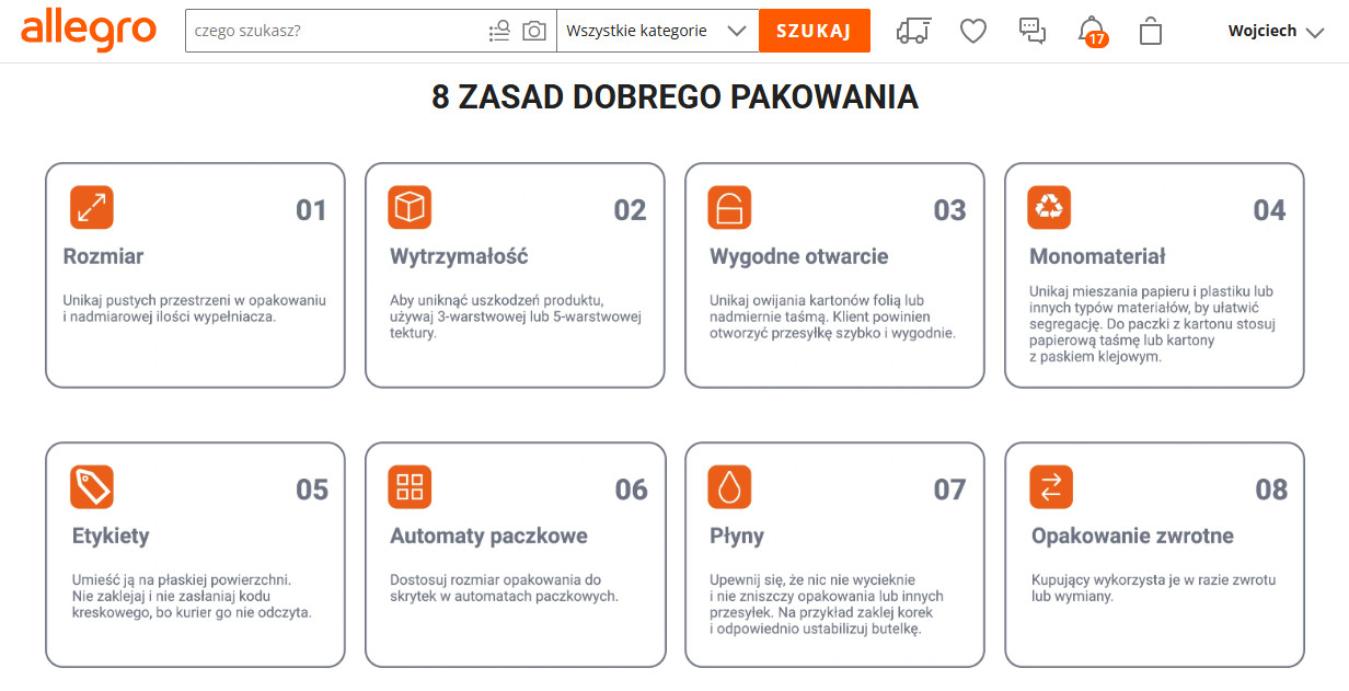 Właśnie to, jak dopasowywać rozmiar opakowania do produktu, z jakich materiałów opakowaniowych korzystać, jak prawidłowo umieszczać etykiety czy jak zabezpieczać produkty, opisano w zestawie wytycznych pod tytułem Standard Pakowania Allegro. Został on opracowany wspólnie przez Allegro, sprzedawców i firmy logistyczne, z uwzględnieniem potrzeb i preferencji występujących w całym łańcuchu dostaw.