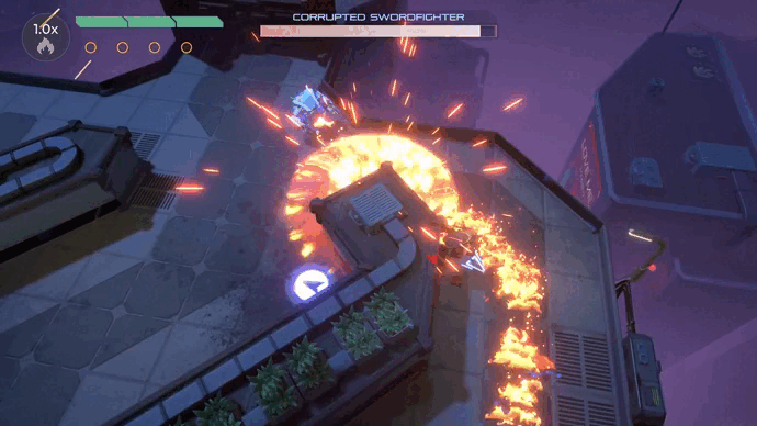 To samo tyczy się „kartridży rozszerzeń” oraz ataków specjalnych. Pierwszy przypadek to umiejętności głównie pasywne – możemy sprawić, że za unikiem mecha pojawi się płonący ślad lub niski poziom zdrowia poskutkuje wyższą prędkością. W drugim przypadku mowa o bardziej aktywnych zagraniach – moim ulubieńcem w tym przypadku jest miecz, który swoją szybkością i zadawanymi obrażeniami przypomina mi taktykę „na Ghostrunnera” – wbiegnij, chlaśnij i ruszaj dalej. Oba systemy wydają mi się bardziej zbalansowane od arsenału – zmiana pasywki lub umiejętności zmieniała moje podejście do taktyki, ale nie czułem, aby jedno rozwiązanie górowało nad drugim.