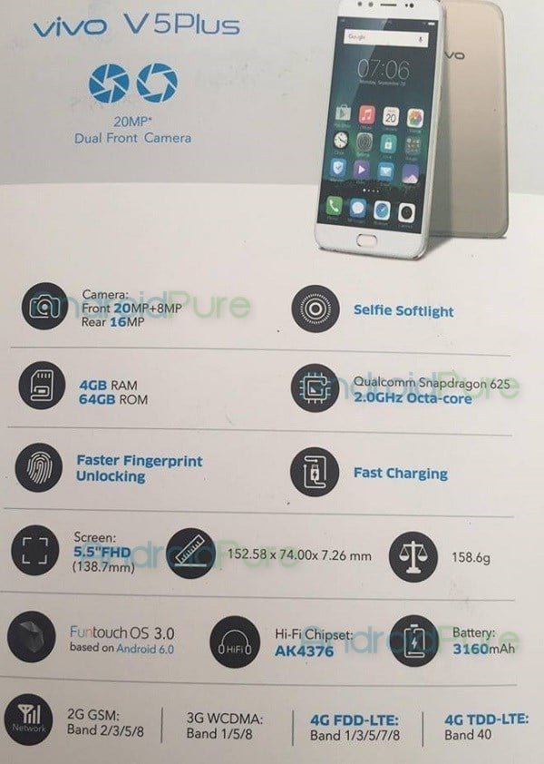 Vivo V5 Plus wyposażono w 5,5-calowy wyświetlacz o rozdzielczości Full HD (1080×1920), ośmiordzeniowy procesor Qualcomm Snapdragon 625 2,0 GHz z układem graficznym Adreno 506, 4GB RAM, 64GB pamięci wewnętrznej z możliwością rozszerzenia przy pomocy karty microSD o maksymalnej pojemności 256GB oraz aparat główny 16 Mpix z pojedynczą diodą doświetlającą.