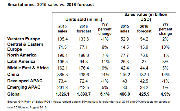 Na początku stycznia od TrendForce dowiedzieliśmy się, że w 2015 roku do rąk klientów trafiło 1,292 miliarda smartfonów. Wtedy też szacowano, że w tym roku wynik ten zostanie poprawiony o kolejne 100 milionów. I rzeczywiście, według najnowszych prognoz GfK, w 2016 roku sprzedanych zostać może nawet 1,394 miliarda inteligentnych telefonów.