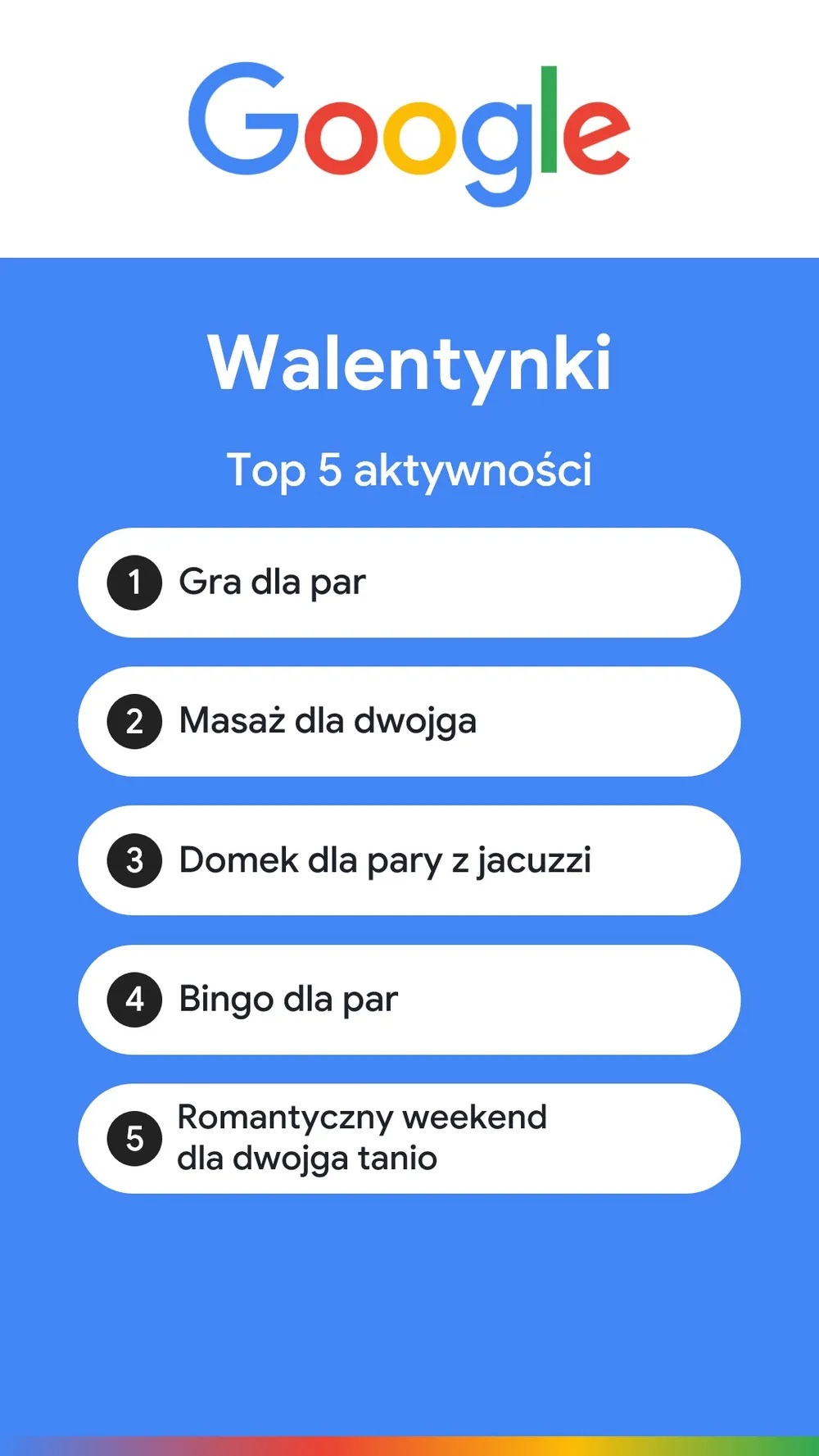 Walentynki to święto zakochanych. Okropnie skomercjalizowane, jednak bardzo chętnie obchodzone przez pary. Google ujawniło, jakie mają plany na ten dzień. Możecie być zaskoczeni.