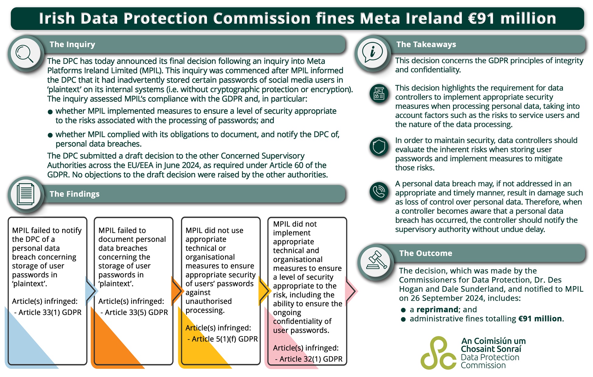 Komisja argumentuje karę faktem, że Meta naruszyła 4 artykuły Ogólnego rozporządzenia o ochronie danych (RODO). Amerykanie nie poinformowali bowiem DPC o zdarzeniu w wymaganym terminie, nie udokumentowali naruszeń danych osobowych dotyczących przechowywania haseł użytkowników w postaci zwykłego tekstu i nie zastosowali odpowiednich środków technicznych lub organizacyjnych w celu zapewnienia odpowiedniego bezpieczeństwa haseł użytkowników przed nieautoryzowanym przetwarzaniem.