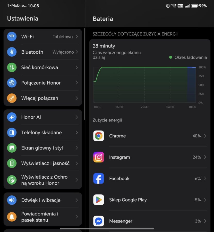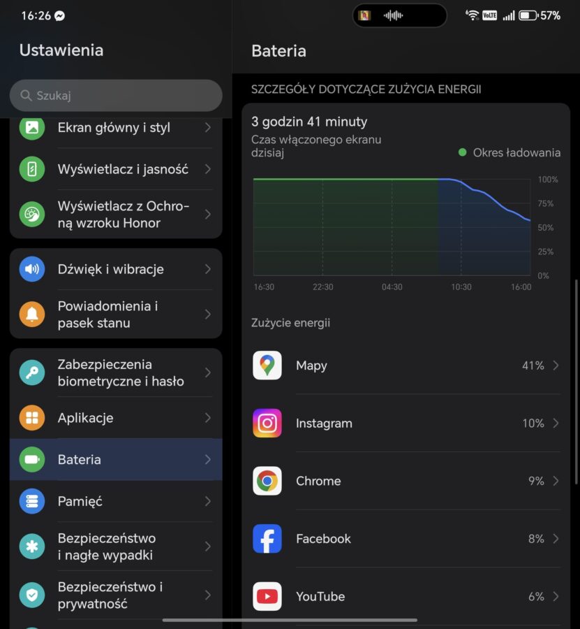 Mam to szczęście, że HONOR Magic V5 był w moich rękach dłużej niż jeden dzień i cóż mogę powiedzieć. Korzystając z niego na WiFi, wieczorem byłam w stanie mieć jeszcze ok. 50% zapasu energii, kończąc dzień z SoT na poziomie 3h49’ czy nawet 61% zapasu i SoT wynoszący 2h49’ w mniej intensywny dzień.