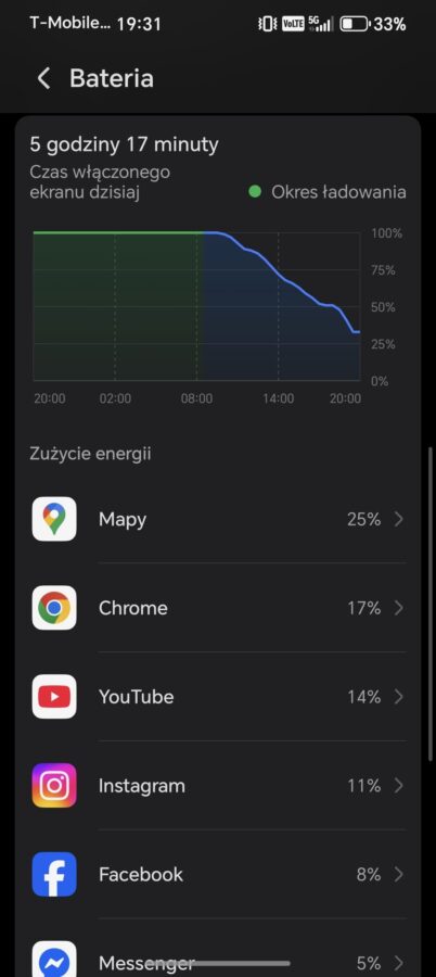 Postanowiłam wyłączyć WiFi i poudawać, że nie ma mnie w domu. W ruch poszło zatem 5G, które szybciej rozładowuje baterię niż WiFi, buszowanie po necie (głównie siedząc w przeglądarce internetowej), a wszystko to na otwartym ekranie. O 19:31 telefon wskazał 33% i 5h17’ SoT, a o 20:13 – 26%.