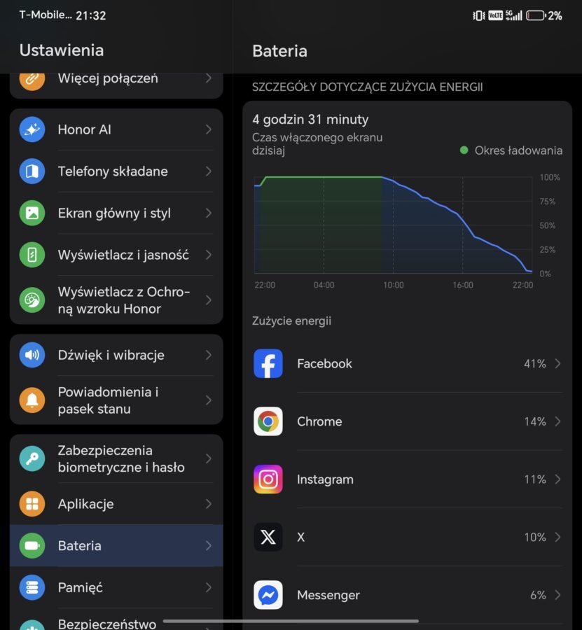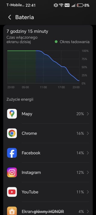 I to był moment, kiedy wróciłam do połączenia WiFi. Złożyłam telefon i siedziałam w social media, wysyłając sobie z mężem słodkie kotki, memy i śmieszno-głupie rolki. O 22:41, gdy wreszcie stwierdziłam, że idę spać, HONOR Magic V5 dalej miał zapas 8% baterii, a SoT wskazywał 7h15’. To naprawdę dobry wynik!