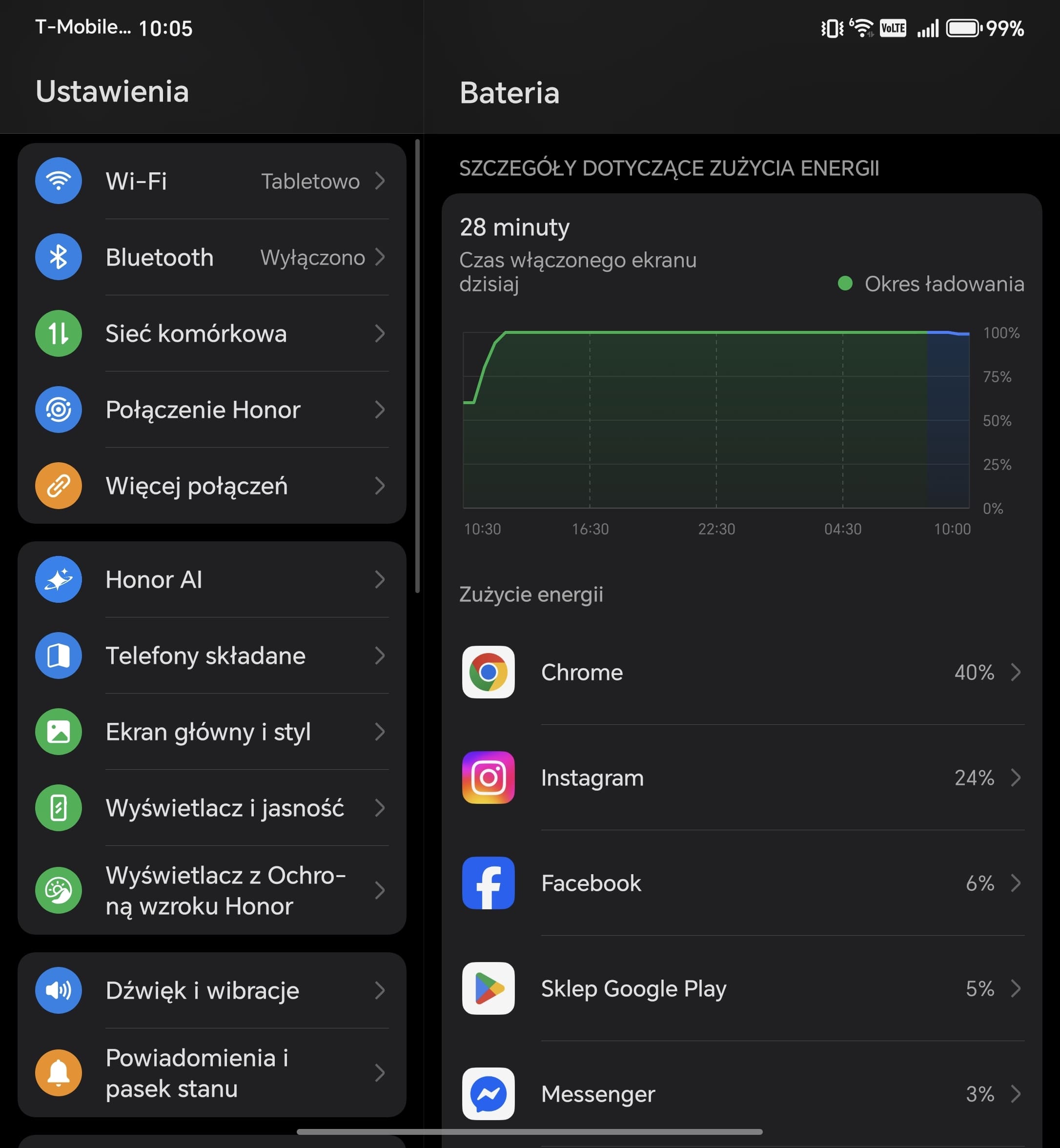 Pobudka: 8:00, wtedy też odpinamy telefon od ładowarki. Dwie godziny ogarniania życia, siebie i kotów, później kawa i półgodzinna prasówka, zrobiona w Chrome na rozłożonym ekranie. Po niecałych 30 minutach telefon pokazuje… 99%. Coś dużo, ale to daje ogromne nadzieje na świetny wynik po całym dniu.