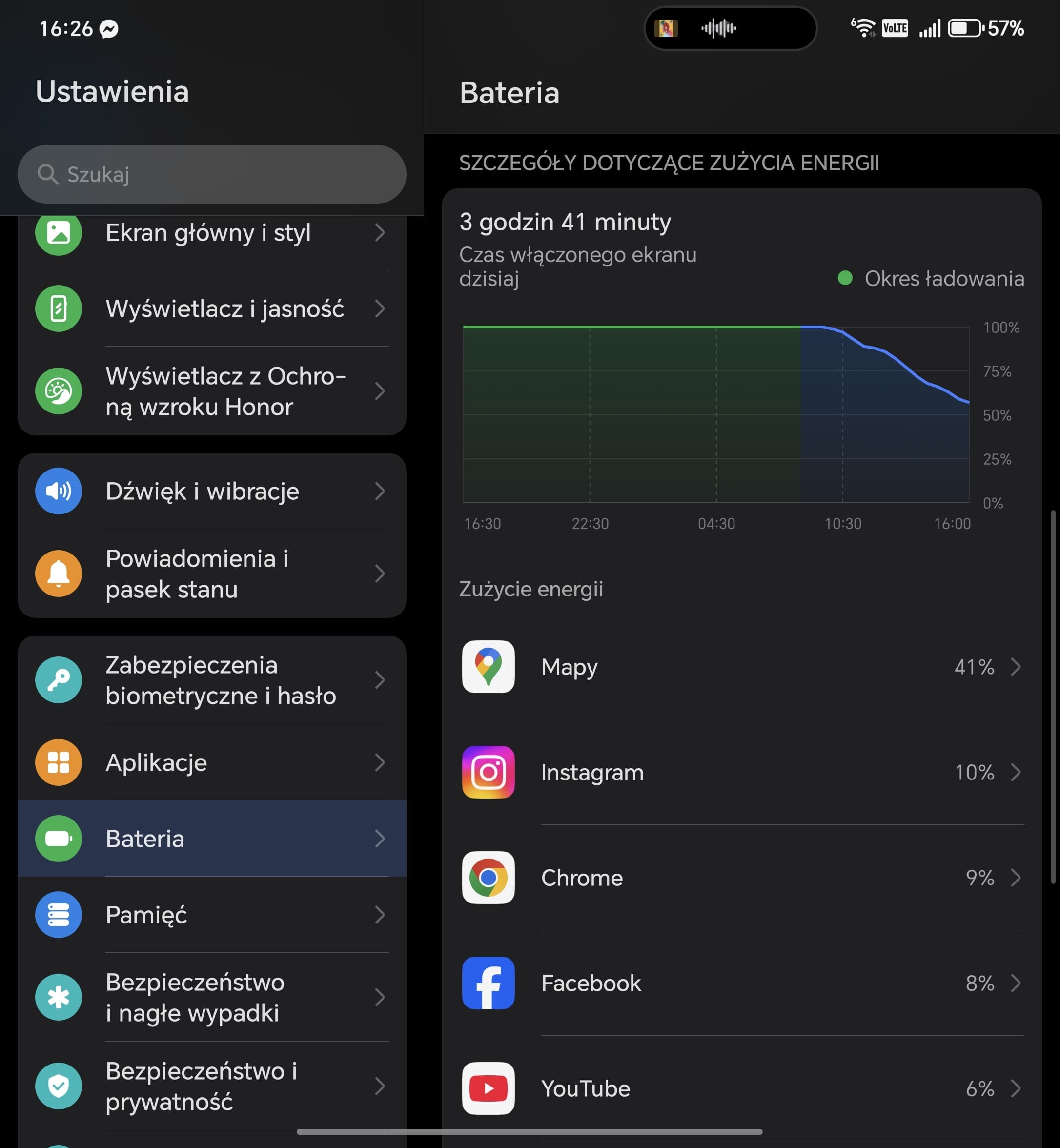 Mam to szczęście, że HONOR Magic V5 był w moich rękach dłużej niż jeden dzień i cóż mogę powiedzieć. Korzystając z niego na WiFi, wieczorem byłam w stanie mieć jeszcze ok. 50% zapasu energii, kończąc dzień z SoT na poziomie 3h49’ czy nawet 61% zapasu i SoT wynoszący 2h49’ w mniej intensywny dzień.