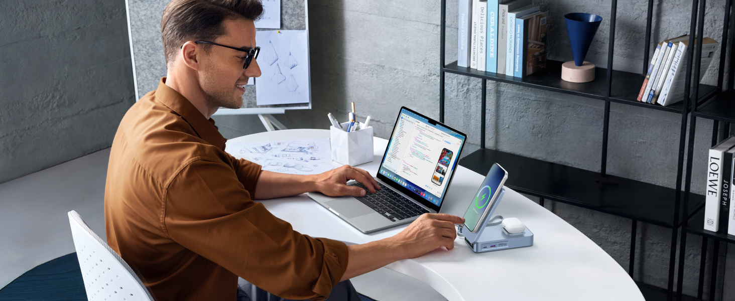 Wszystko dzięki opcji odchylenia głównego krążka indukcyjnego, opracowanego zgodnie ze standardem Qi2. Jeżeli więc Wasze urządzenie wykorzystuje w jakiś sposób magnesy do pozycjonowania się na ładowarce bezprzewodowej, możecie wykorzystać powerbank jak stację dokującą. Zawias zatrzymuje się w dwóch pozycjach – pod kątem 45 i 70 stopni i w obu ukazuje dostęp do drugiego pola indukcyjnego, dedykowanego możliwości ładowania słuchawek czy smartwatcha.