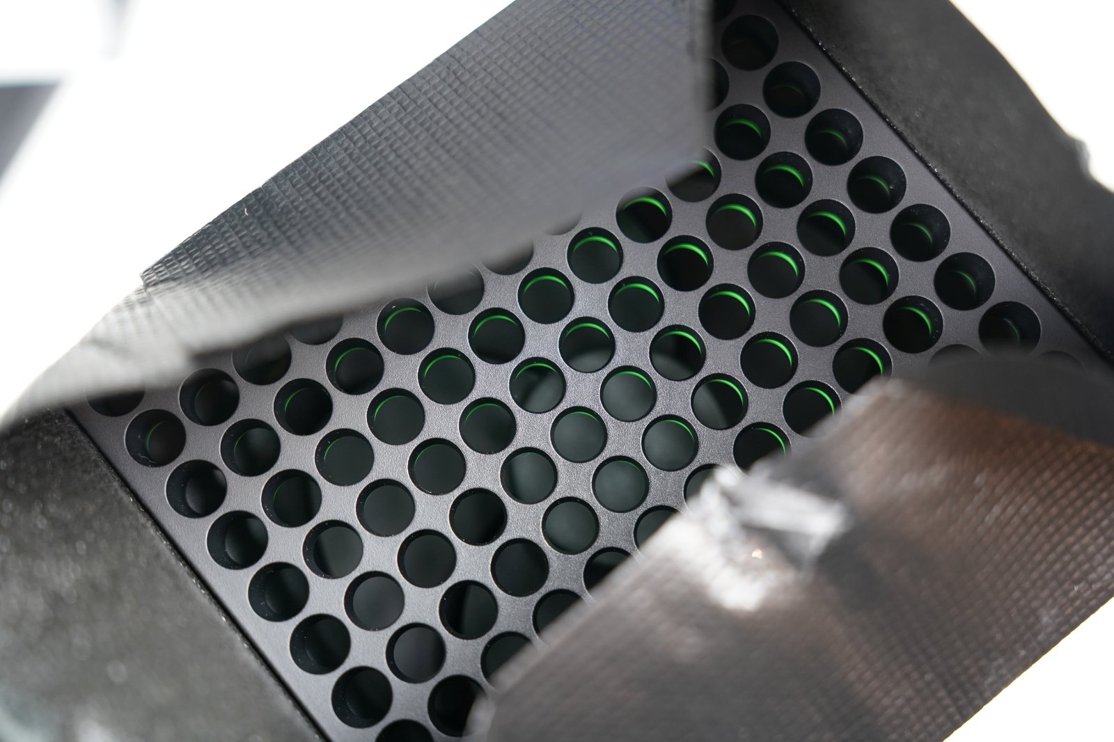 Pora rozpakować króla tego unboxingu – Xbox Series X. Zdejmując wierzchnią warstwę materiału ukazuje nam się góra urządzenia o charakterystycznym wzorze. W środku możemy dojrzeć potężny wentylator.