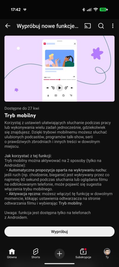 Rozwiązanie o nazwie Tryb mobilny pozwala na aktywowanie prostego interfejsu z dużymi elementami sterującymi, który ma sprawdzić się chociażby w trakcie spaceru czy biegania. Owszem, raczej nikt nie ogląda wówczas filmów, ale przecież YouTube to też świetna platforma do słuchania podcastów.