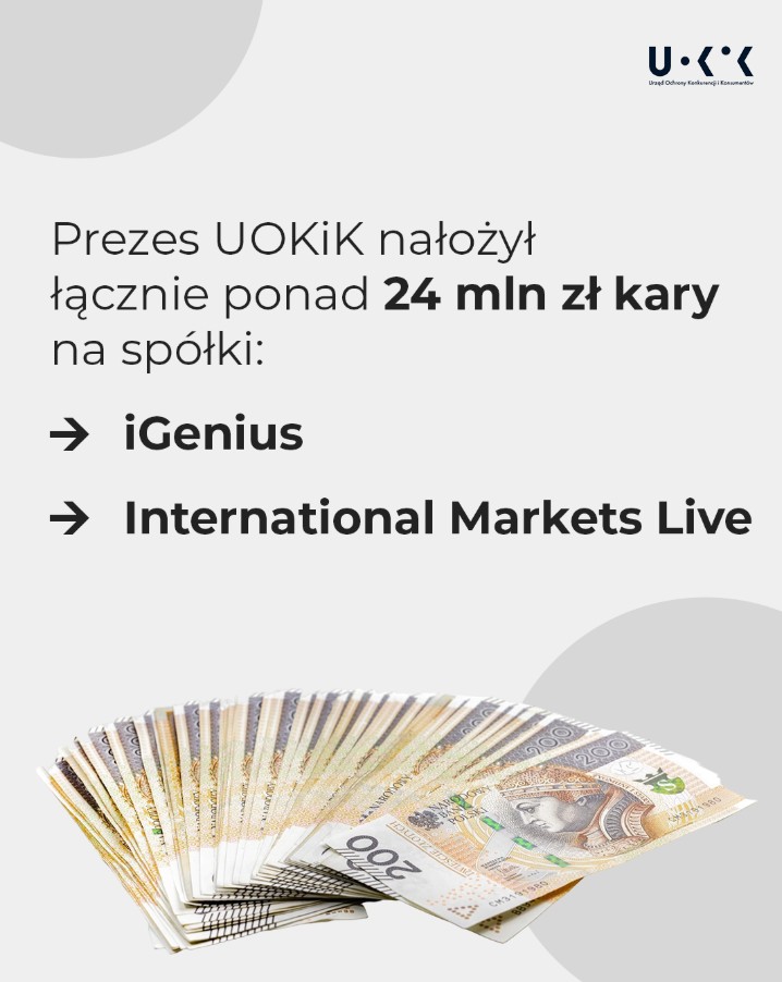 Przedsiębiorstwa te deklarowały, że prowadzą działalność edukacyjną, jednak z czasem okazało się, iż ich model funkcjonowania oparty jest na zakazanym systemie promocyjnym typu piramida. Po zbadaniu sprawy Prezes UOKiK Tomasz Chróstny nałożył na przedsiębiorstwa kary w wysokości ponad 14,6 miliona złotych na iGenius (decyzja nie jest prawomocna) i prawie 9,5 miliona złotych na International Markets Live (w tym przypadku decyzja jest prawomocna).