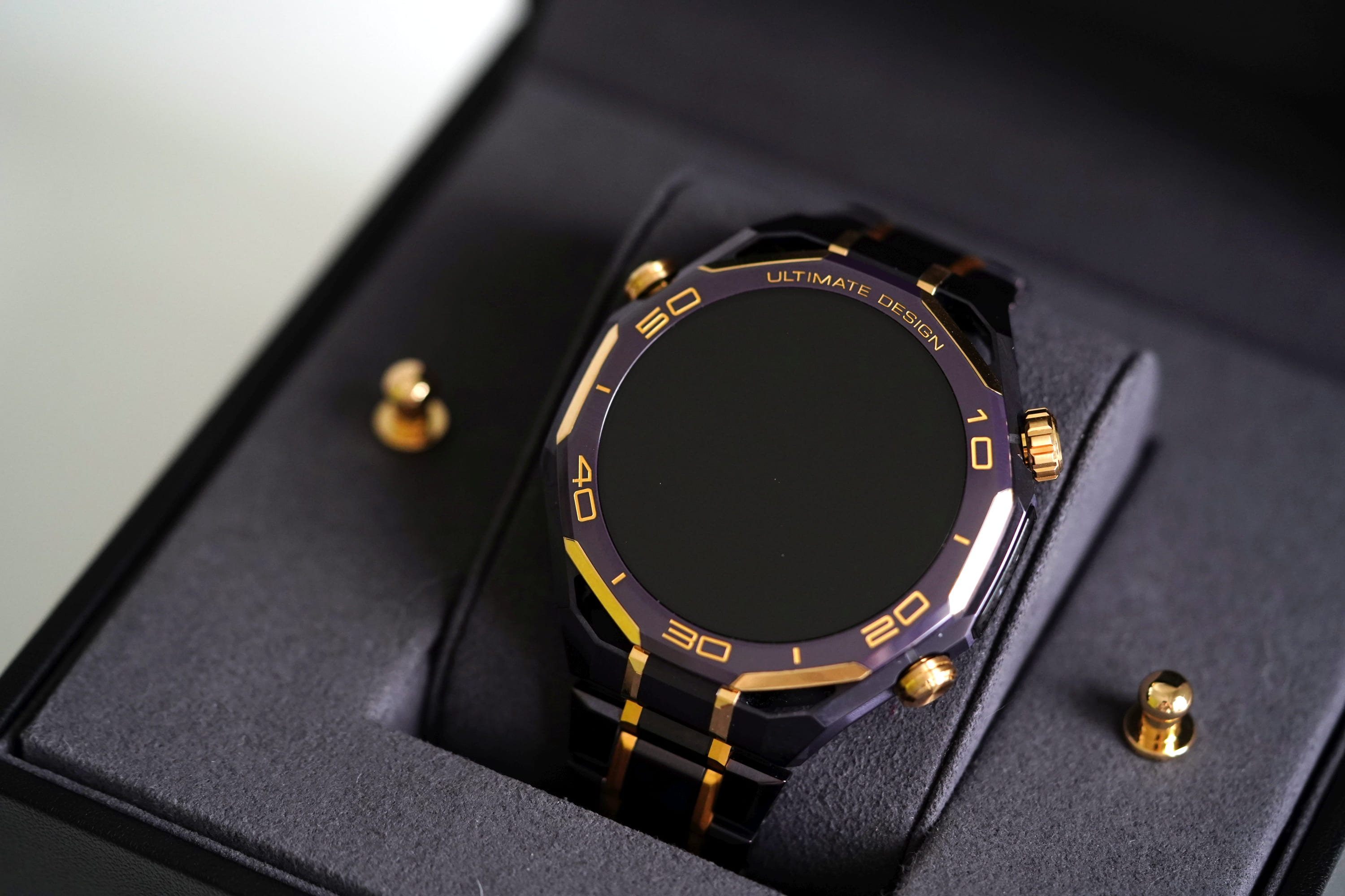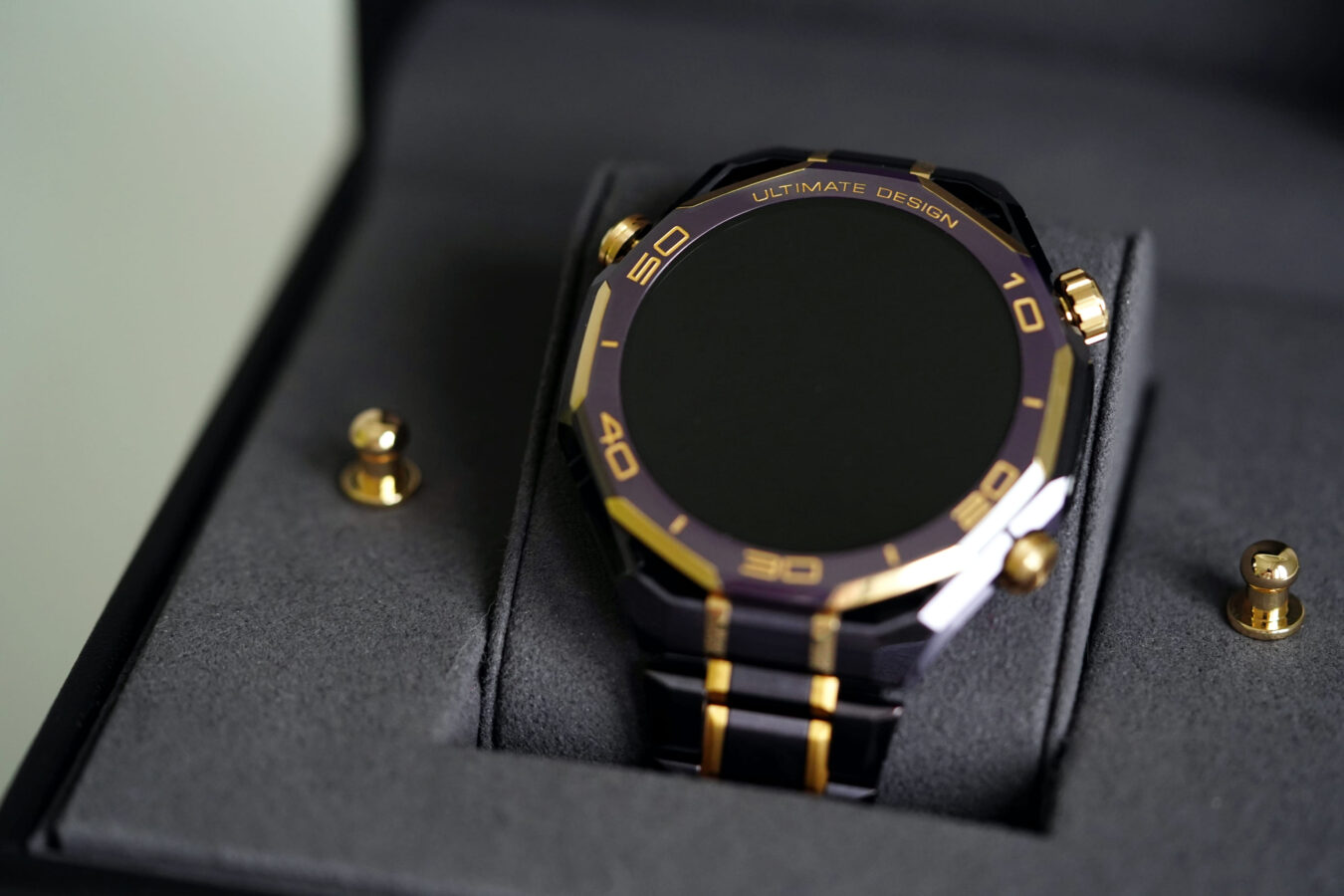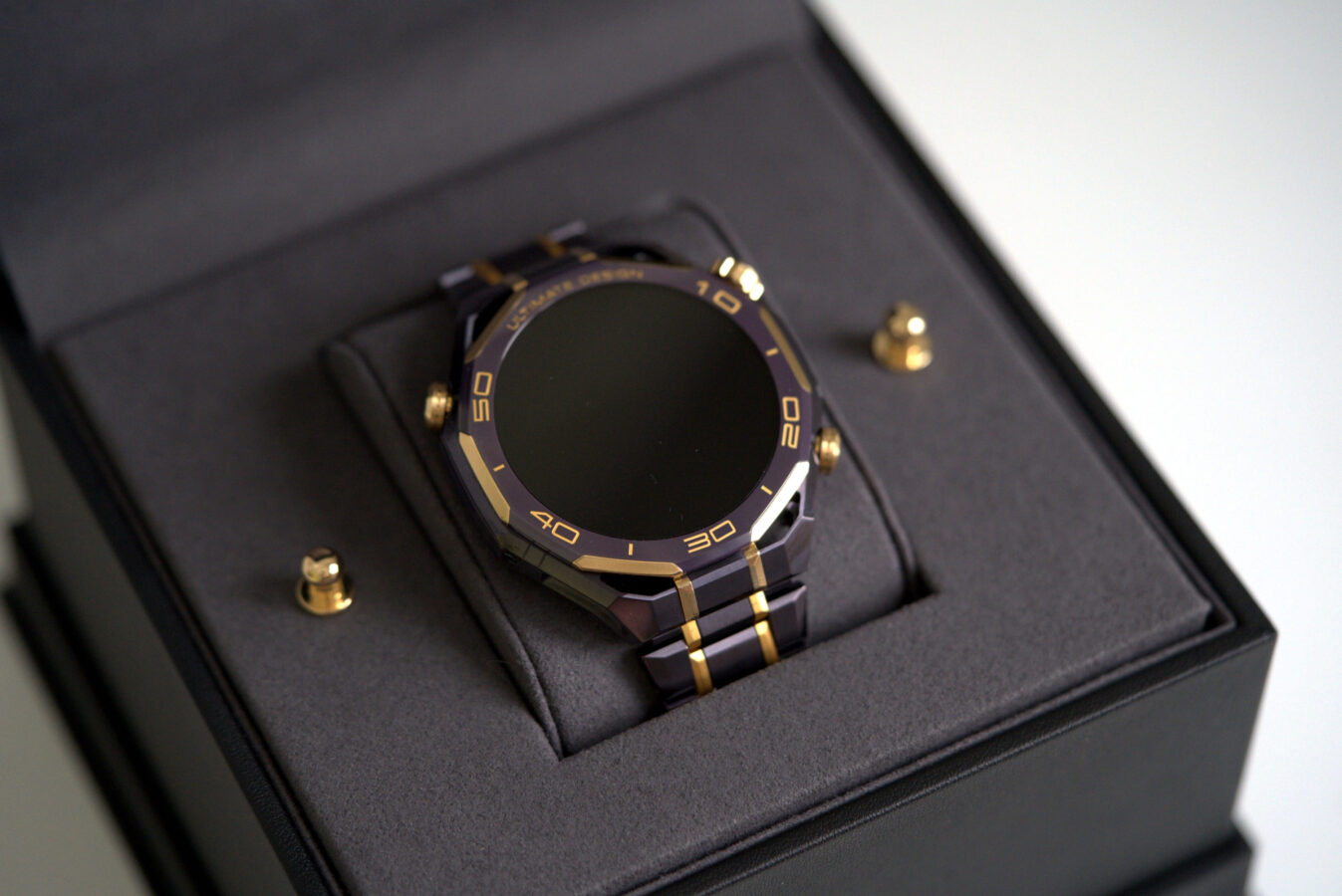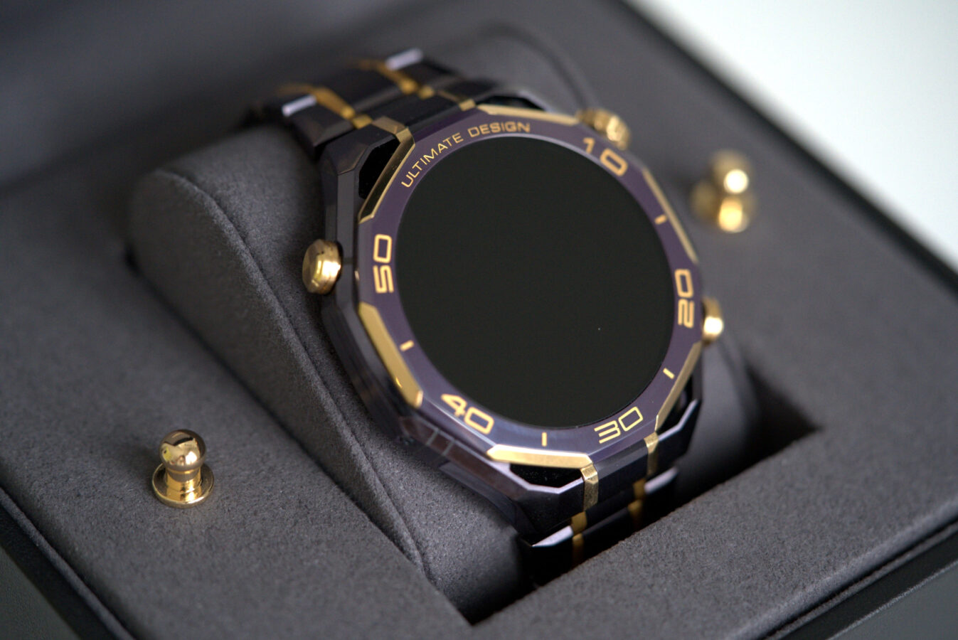 W modelu Huawei Watch Ultimate Design Royal Gold Edition wszystko to jest opakowane w luksusową formę. Kopertę wykonano ze stopu metali na bazie cyrkonu, bezel z ceramiki wzbogaconej o pierwiastki ziem rzadkich, koronkę z 18-karatowego złota, a całość uzupełniają mikroszlify i akcenty z 24-karatowego złota.