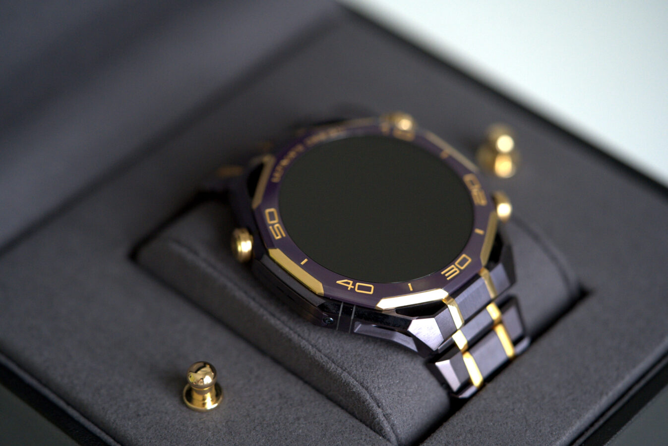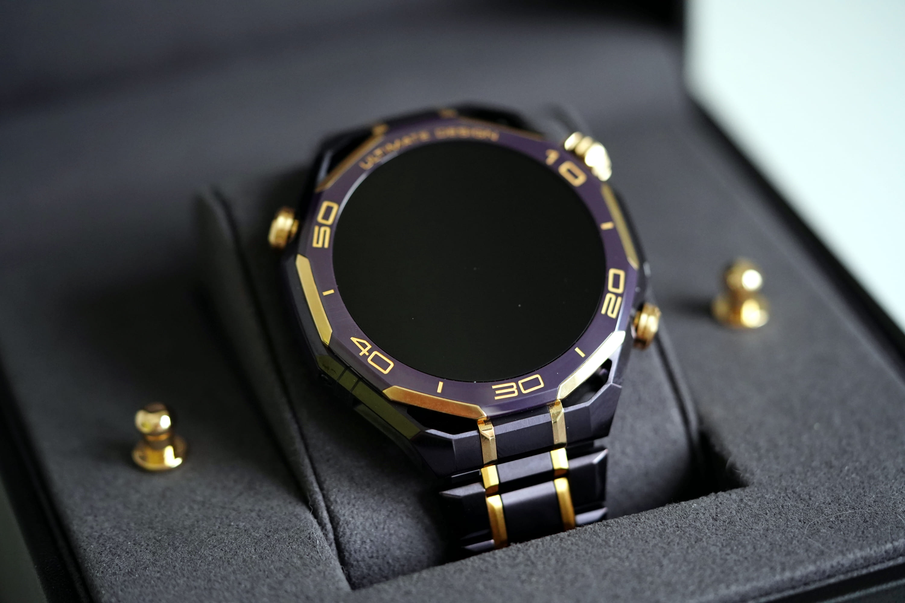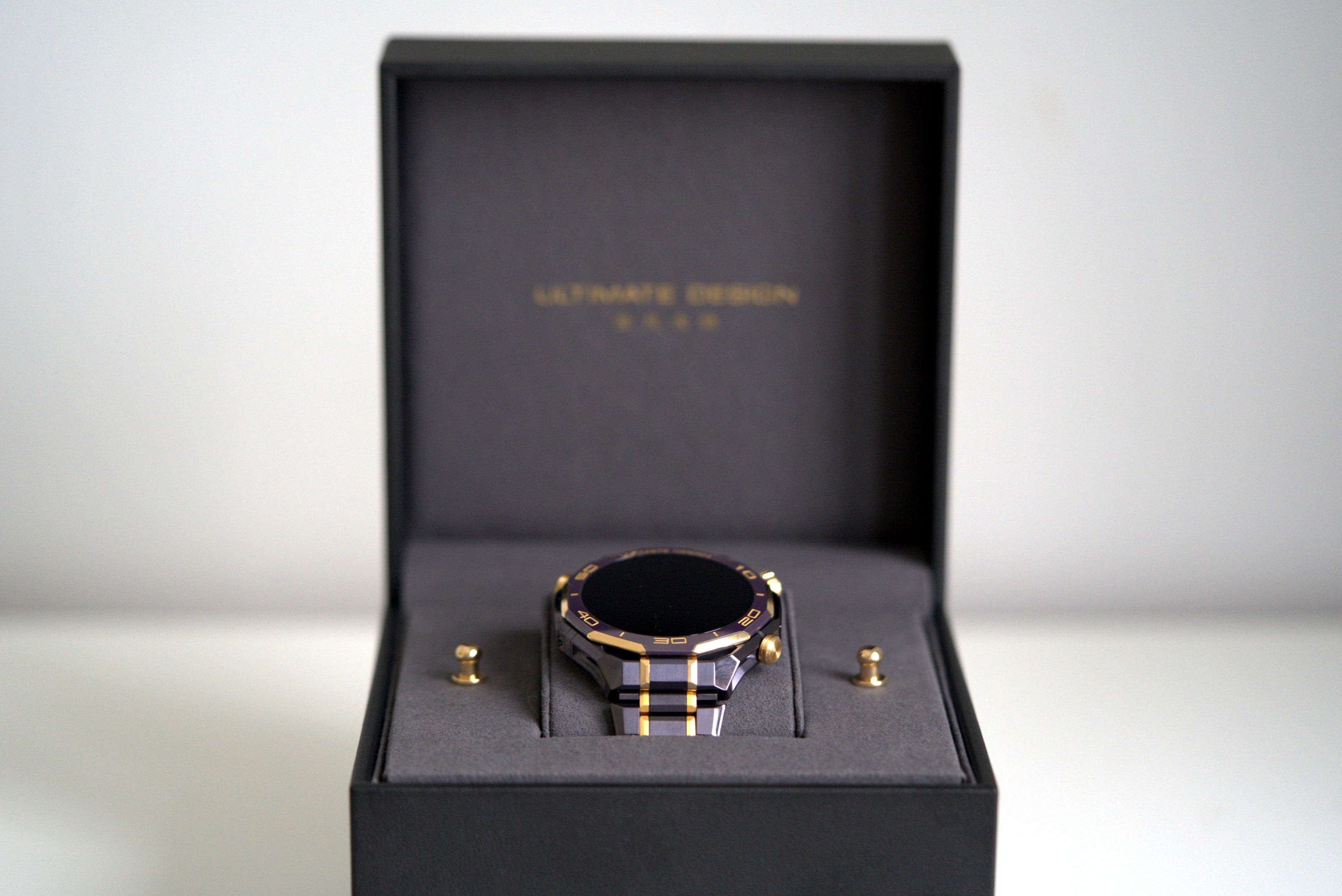 W modelu Huawei Watch Ultimate Design Royal Gold Edition wszystko to jest opakowane w luksusową formę. Kopertę wykonano ze stopu metali na bazie cyrkonu, bezel z ceramiki wzbogaconej o pierwiastki ziem rzadkich, koronkę z 18-karatowego złota, a całość uzupełniają mikroszlify i akcenty z 24-karatowego złota.