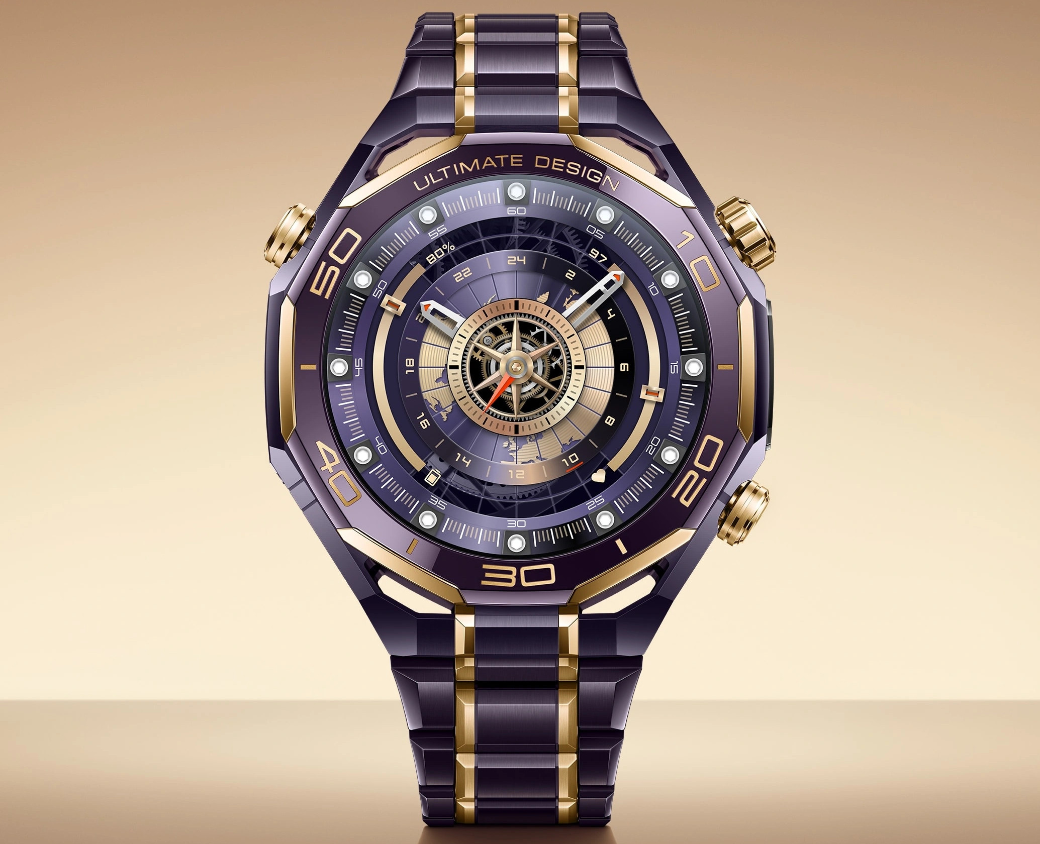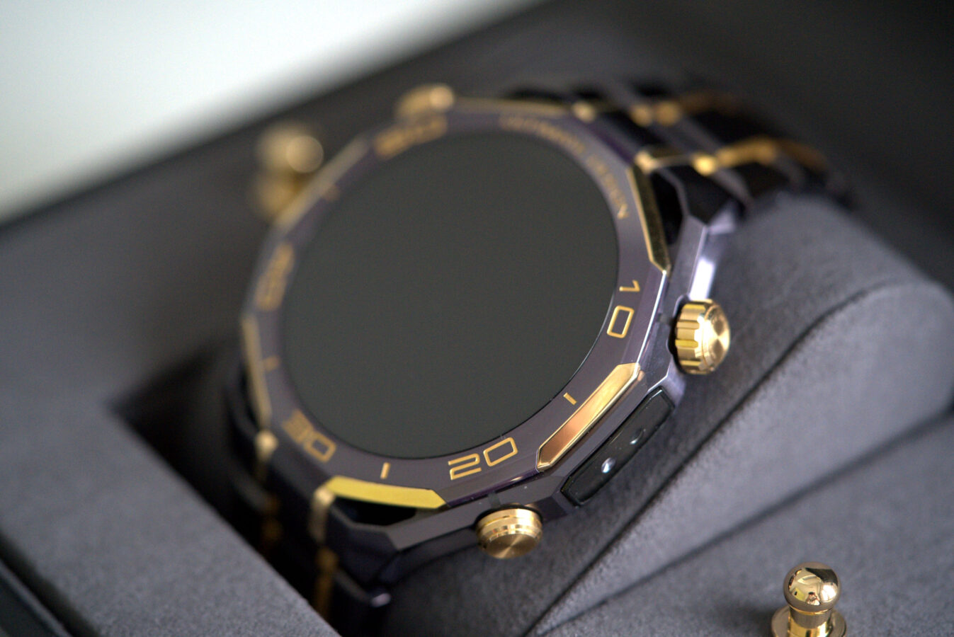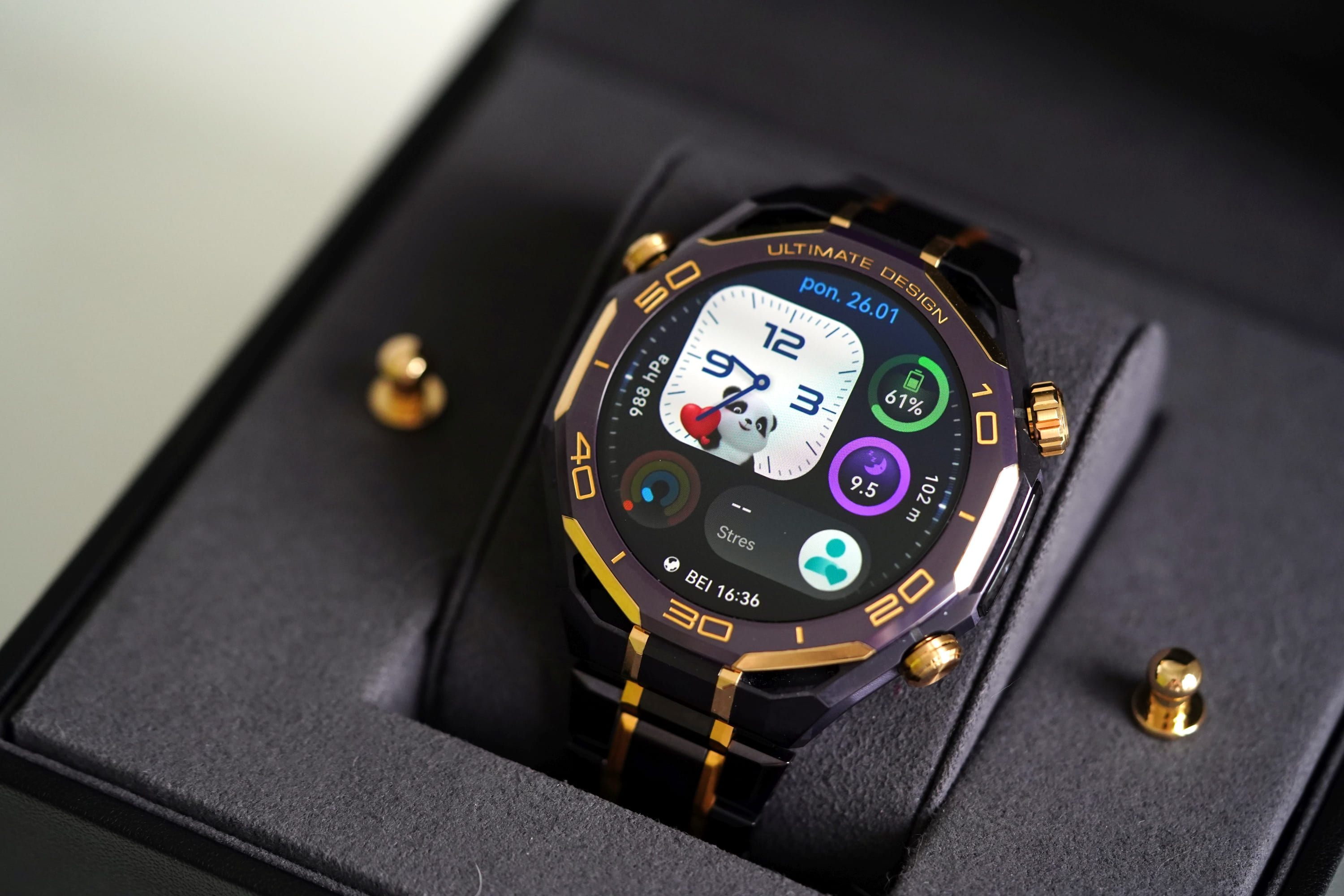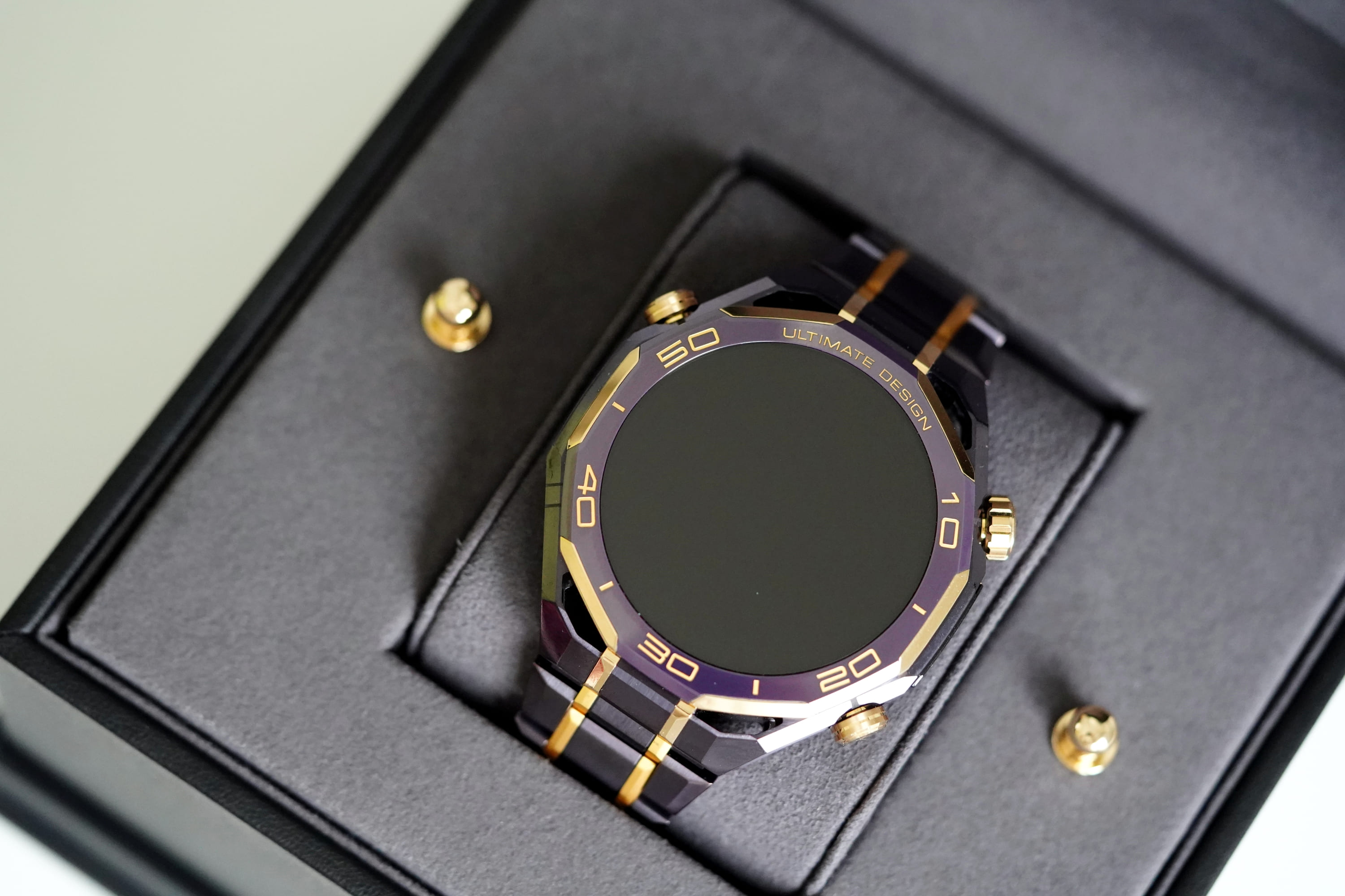 W modelu Huawei Watch Ultimate Design Royal Gold Edition wszystko to jest opakowane w luksusową formę. Kopertę wykonano ze stopu metali na bazie cyrkonu, bezel z ceramiki wzbogaconej o pierwiastki ziem rzadkich, koronkę z 18-karatowego złota, a całość uzupełniają mikroszlify i akcenty z 24-karatowego złota.